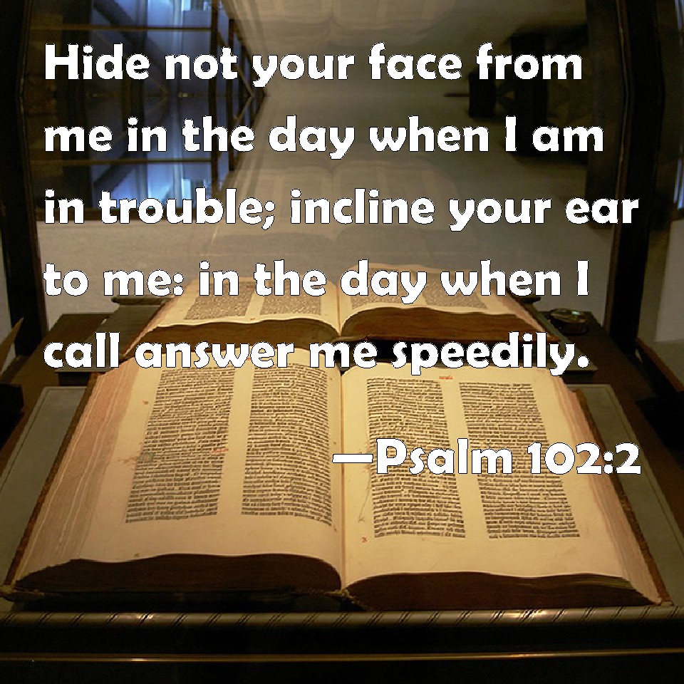 Choose a Background Psalm 102:2 Hide not your face from me in the day when I am in trouble; incline your ear to me: in the day when I call answer me speedily. KJV: Hide not thy face from me in the day when I am in trouble; incline thine ear unto me: in the day when I call answer me speedily. DRB: Turn not away thy face from me: in the day when I am in trouble, incline thy ear to me. In what day soever I shall call upon thee, hear me speedily. DBT: Hide not thy face from me: in the day of my trouble, incline thine ear unto me; in the day I call, answer me speedily. ERV: Hide not thy face from me in the day of my distress: incline thine ear unto me; in the day when I call answer me speedily. WBT: Hide not thy face from me in the day when I am in trouble; incline thy ear to me: in the day when I call, answer me speedily. WEB: Don't hide your face from me in the day of my distress. Turn your ear to me. Answer me quickly in the day when I call. YLT: Hide not Thou Thy face from me, In a day of mine adversity, Incline unto me Thine ear, In the day I call, haste, answer me.Links Psalm 102:2 NIV • Psalm 102:2 NLT • Psalm 102:2 ESV • Psalm 102:2 NASB • Psalm 102:2 KJV • Psalm 102:2 Interlinear • Psalm 102:2 Commentaries • Psalm 102:2 Parallel Texts • Psalm 102:2 Bible Apps • Psalm 102:2 Parallel • Bible Hub |