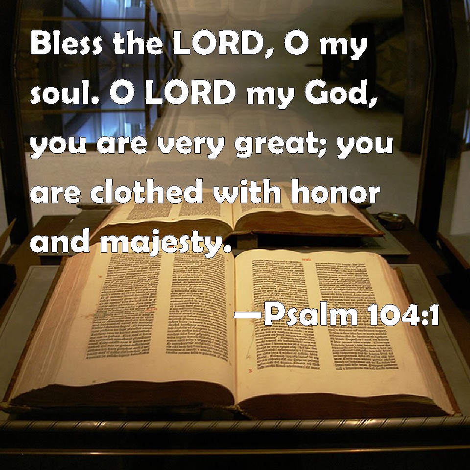 Choose a Background Psalm 104:1 Bless the LORD, O my soul. O LORD my God, you are very great; you are clothed with honor and majesty. KJV: Bless the LORD, O my soul. O LORD my God, thou art very great; thou art clothed with honour and majesty. DRB: For David himself. Bless the Lord, O my soul: O Lord my God, thou art exceedingly great. Thou hast put on praise and beauty: DBT: Bless Jehovah, O my soul! Jehovah my God, thou art very great; thou art clothed with majesty and splendour; ERV: Bless the LORD O my soul, O LORD my God, thou art very great; thou art clothed with honour and majesty. WBT: Bless the LORD, O my soul. O LORD my God, thou art very great; thou art clothed with honor and majesty. WEB: Bless Yahweh, my soul. Yahweh, my God, you are very great. You are clothed with honor and majesty. YLT: Bless, O my soul, Jehovah! Jehovah, my God, Thou hast been very great, Honour and majesty Thou hast put on.Links Psalm 104:1 NIV • Psalm 104:1 NLT • Psalm 104:1 ESV • Psalm 104:1 NASB • Psalm 104:1 KJV • Psalm 104:1 Interlinear • Psalm 104:1 Commentaries • Psalm 104:1 Parallel Texts • Psalm 104:1 Bible Apps • Psalm 104:1 Parallel • Bible Hub |