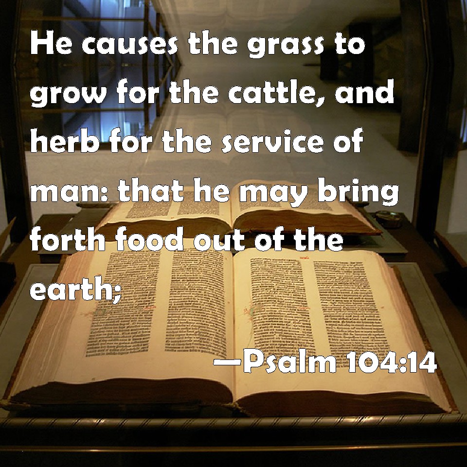 Choose a Background Psalm 104:14 He causes the grass to grow for the cattle, and herb for the service of man: that he may bring forth food out of the earth; KJV: He causeth the grass to grow for the cattle, and herb for the service of man: that he may bring forth food out of the earth; DRB: Bringing forth grass for cattle, and herb for the service of men. That thou mayst bring bread out of the earth: DBT: He maketh the grass to grow for the cattle, and herb for the service of man; bringing forth bread out of the earth, ERV: He causeth the grass to grow for the cattle, and herb for the service of man; that he may bring forth food out of the earth: WBT: He causeth the grass to grow for the cattle, and herb for the service of man: that he may bring forth food out of the earth; WEB: He causes the grass to grow for the livestock, and plants for man to cultivate, that he may bring forth food out of the earth: YLT: Causing grass to spring up for cattle, And herb for the service of man, To bring forth bread from the earth,Links Psalm 104:14 NIV • Psalm 104:14 NLT • Psalm 104:14 ESV • Psalm 104:14 NASB • Psalm 104:14 KJV • Psalm 104:14 Interlinear • Psalm 104:14 Commentaries • Psalm 104:14 Parallel Texts • Psalm 104:14 Bible Apps • Psalm 104:14 Parallel • Bible Hub |