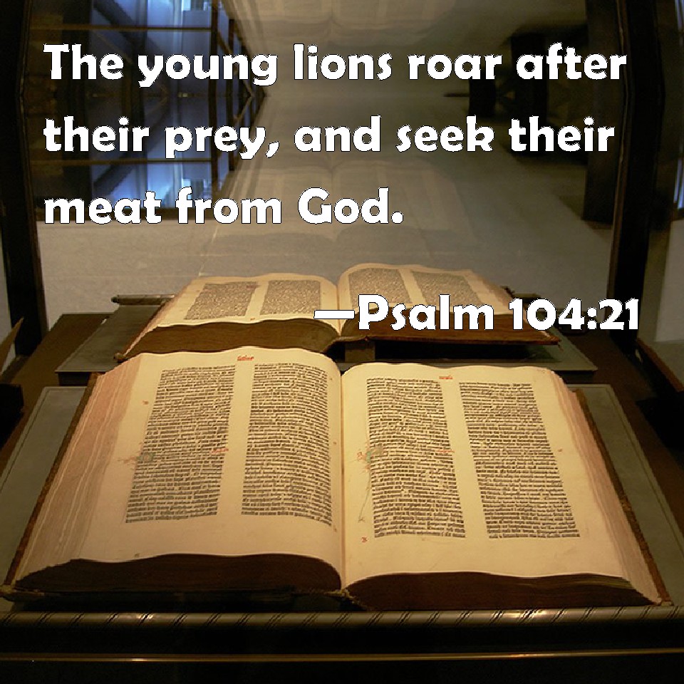 Psalm 104:21 The young lions roar after their prey, and seek their meat from God.