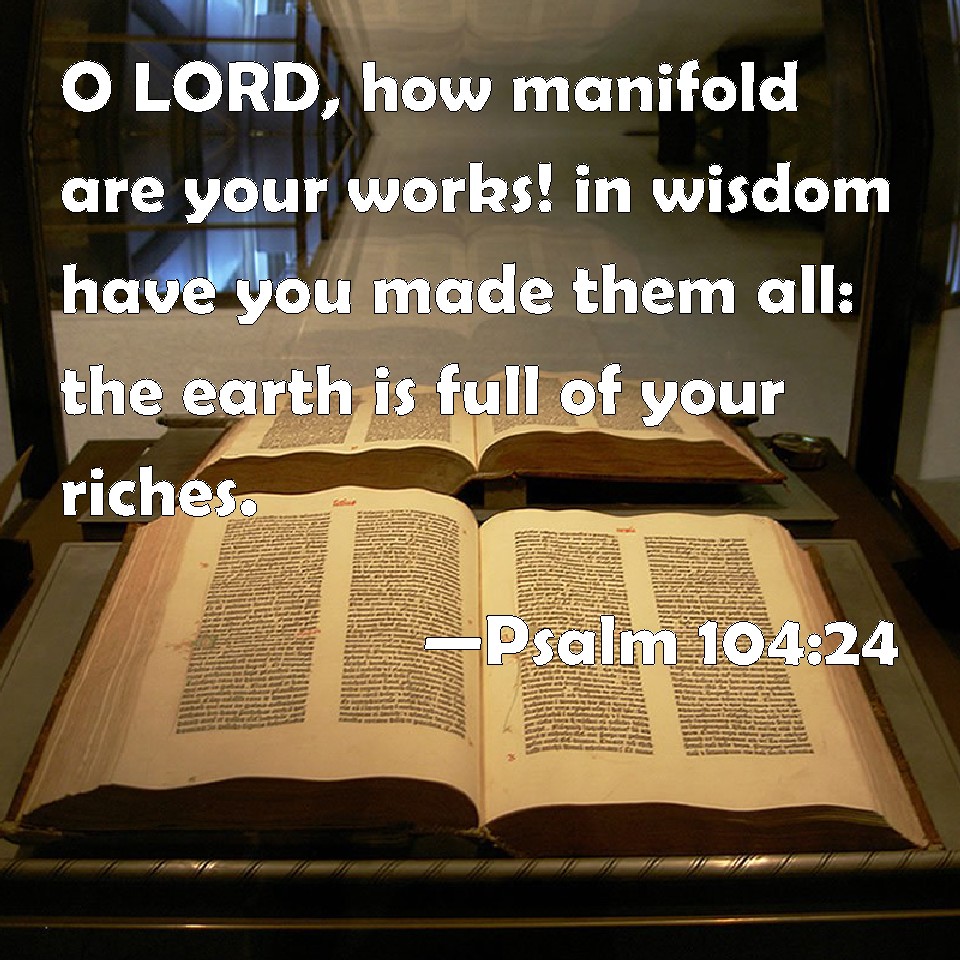 Choose a Background Psalm 104:24 O LORD, how manifold are your works! in wisdom have you made them all: the earth is full of your riches. KJV: O LORD, how manifold are thy works! in wisdom hast thou made them all: the earth is full of thy riches. DRB: How great are thy works, O Lord? thou hast made all things in wisdom: the earth is filled with thy riches. DBT: How manifold are thy works, O Jehovah! in wisdom hast thou made them all: the earth is full of thy riches. ERV: O LORD, how manifold are thy works! in wisdom hast thou made them all: the earth is full of thy riches. WBT: O LORD, how manifold are thy works! in wisdom hast thou made them all: the earth is full of thy riches. WEB: Yahweh, how many are your works! In wisdom have you made them all. The earth is full of your riches. YLT: How many have been Thy works, O Jehovah, All of them in wisdom Thou hast made, Full is the earth of thy possessions.Links Psalm 104:24 NIV • Psalm 104:24 NLT • Psalm 104:24 ESV • Psalm 104:24 NASB • Psalm 104:24 KJV • Psalm 104:24 Interlinear • Psalm 104:24 Commentaries • Psalm 104:24 Parallel Texts • Psalm 104:24 Bible Apps • Psalm 104:24 Parallel • Bible Hub |