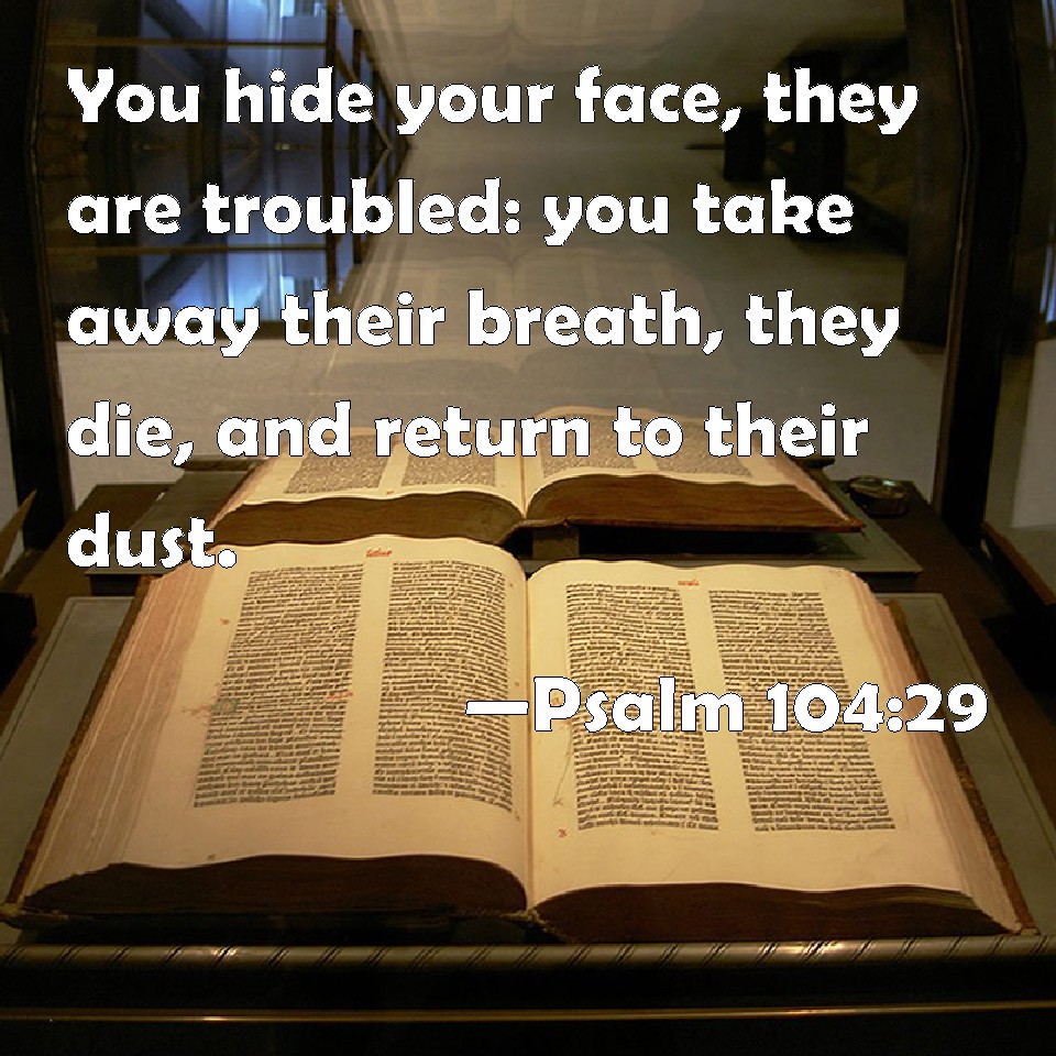 Choose a Background Psalm 104:29 You hide your face, they are troubled: you take away their breath, they die, and return to their dust. KJV: Thou hidest thy face, they are troubled: thou takest away their breath, they die, and return to their dust. DRB: But if thou turnest away thy face, they shall be troubled: thou shalt take away their breath, and they shall fail, and shall return to their dust. DBT: Thou hidest thy face, they are troubled; thou takest away their breath, they expire and return to their dust. ERV: Thou hidest thy face, they are troubled; thou takest away their breath they die, and return to their dust. WBT: Thou hidest thy face, they are troubled: thou takest away their breath, they die, and return to their dust. WEB: You hide your face: they are troubled; you take away their breath: they die, and return to the dust. YLT: Thou hidest Thy face — they are troubled, Thou gatherest their spirit — they expire, And unto their dust they turn back.Links Psalm 104:29 NIV • Psalm 104:29 NLT • Psalm 104:29 ESV • Psalm 104:29 NASB • Psalm 104:29 KJV • Psalm 104:29 Interlinear • Psalm 104:29 Commentaries • Psalm 104:29 Parallel Texts • Psalm 104:29 Bible Apps • Psalm 104:29 Parallel • Bible Hub |