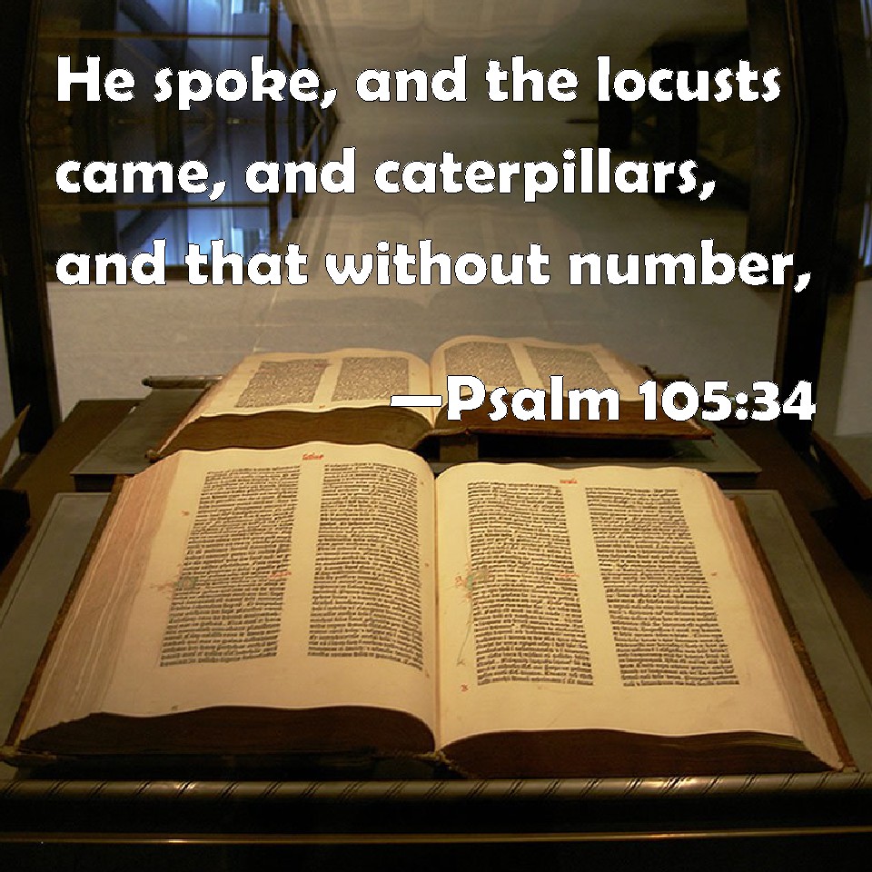 Choose a Background Psalm 105:34 He spoke, and the locusts came, and caterpillars, and that without number, KJV: He spake, and the locusts came, and caterpillers, and that without number, DRB: He spoke, and the locust came, and the bruchus, of which there was no number. DBT: He spoke, and the locust came, and the cankerworm, even without number; ERV: He spake, and the locust came, and the cankerworm, and that without number, WBT: He spoke, and the locusts came, and caterpillars, and that without number, WEB: He spoke, and the locusts came, and the grasshoppers, without number, YLT: He hath said, and the locust cometh, And the cankerworm — innumerable,Links Psalm 105:34 NIV • Psalm 105:34 NLT • Psalm 105:34 ESV • Psalm 105:34 NASB • Psalm 105:34 KJV • Psalm 105:34 Interlinear • Psalm 105:34 Commentaries • Psalm 105:34 Parallel Texts • Psalm 105:34 Bible Apps • Psalm 105:34 Parallel • Bible Hub |