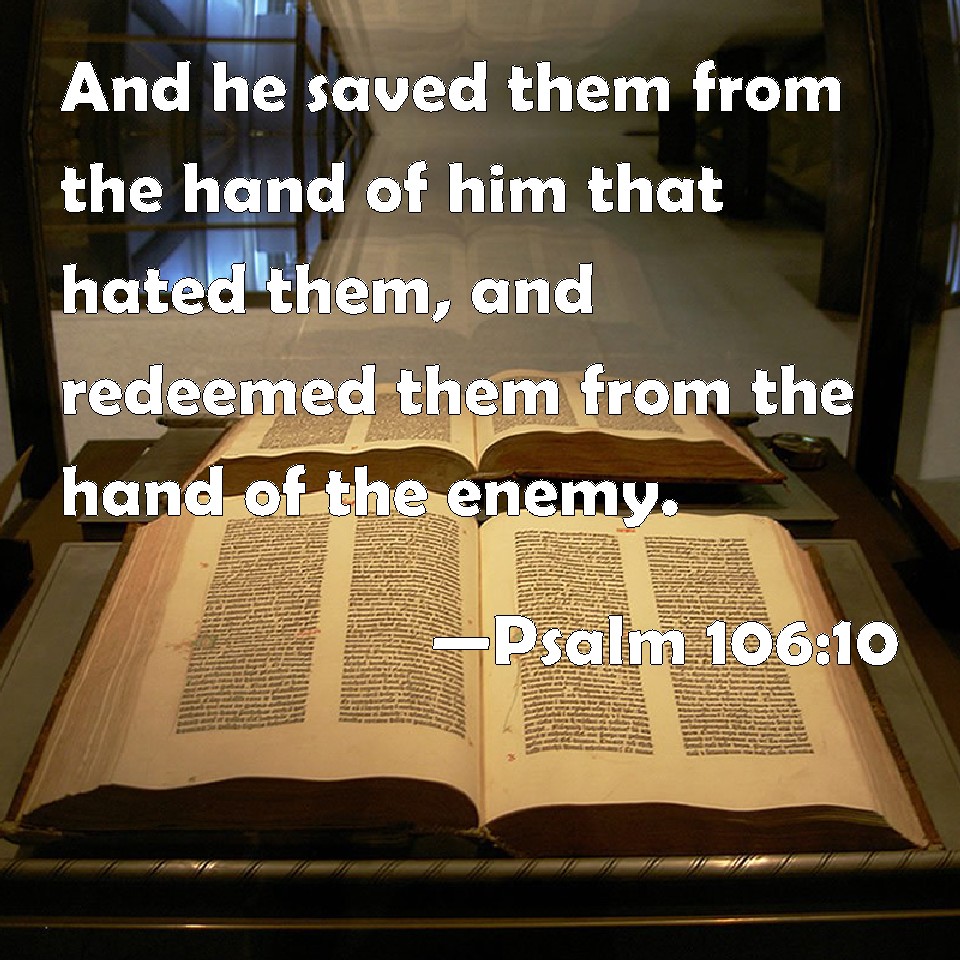 Psalm 106:10 And he saved them from the hand of him that hated them, and redeemed them from the hand of the enemy.