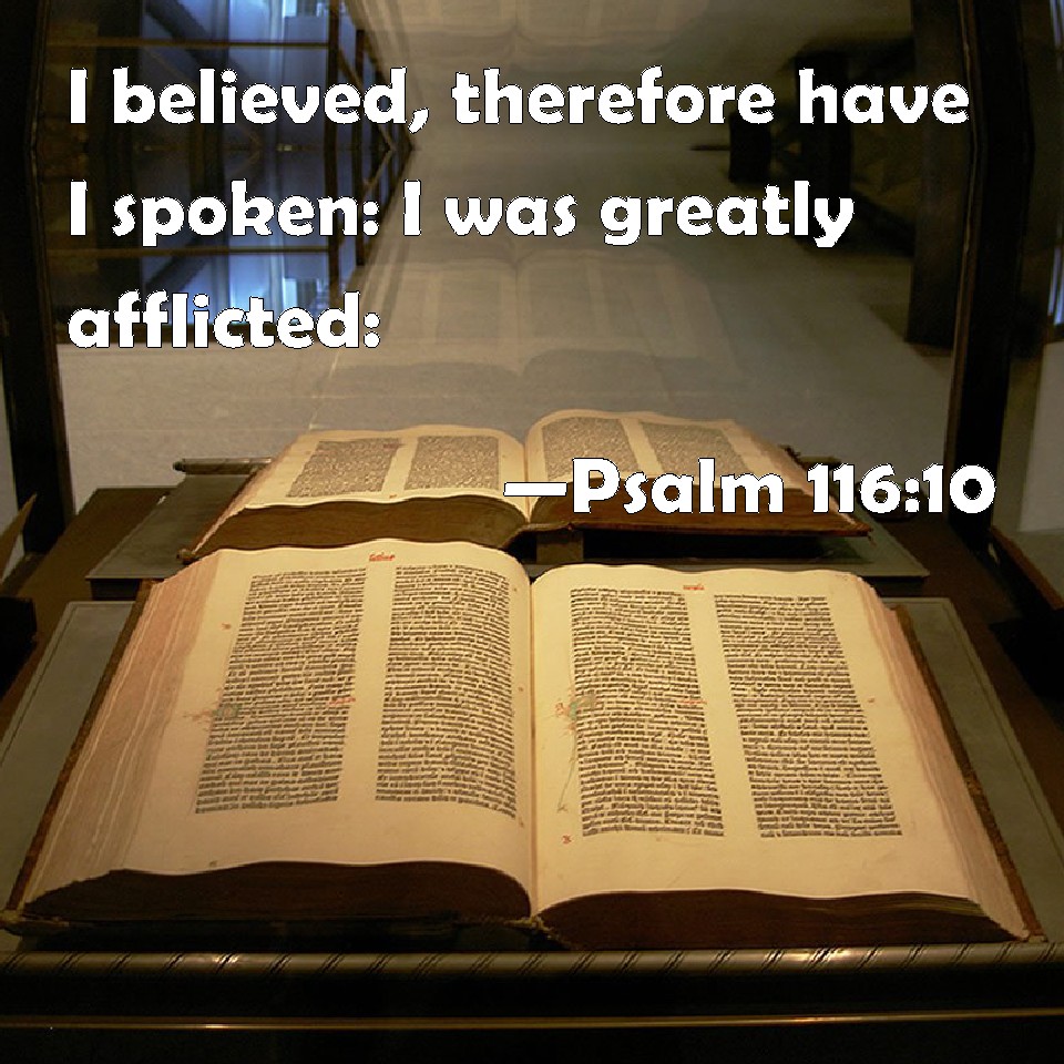 Choose a Background Psalm 116:10 I believed, therefore have I spoken: I was greatly afflicted: KJV: I believed, therefore have I spoken: I was greatly afflicted: DRB: I have believed, therefore have I spoken; but I have been humbled exceedingly. DBT: I believed, therefore have I spoken. As for me, I was greatly afflicted. ERV: I believe, for I will speak: I was greatly afflicted: WBT: I believed, therefore have I spoken: I was greatly afflicted: WEB: I believed, therefore I said, "I was greatly afflicted." YLT: I have believed, for I speak, I — I have been afflicted greatly.Links Psalm 116:10 NIV • Psalm 116:10 NLT • Psalm 116:10 ESV • Psalm 116:10 NASB • Psalm 116:10 KJV • Psalm 116:10 Interlinear • Psalm 116:10 Commentaries • Psalm 116:10 Parallel Texts • Psalm 116:10 Bible Apps • Psalm 116:10 Parallel • Bible Hub |