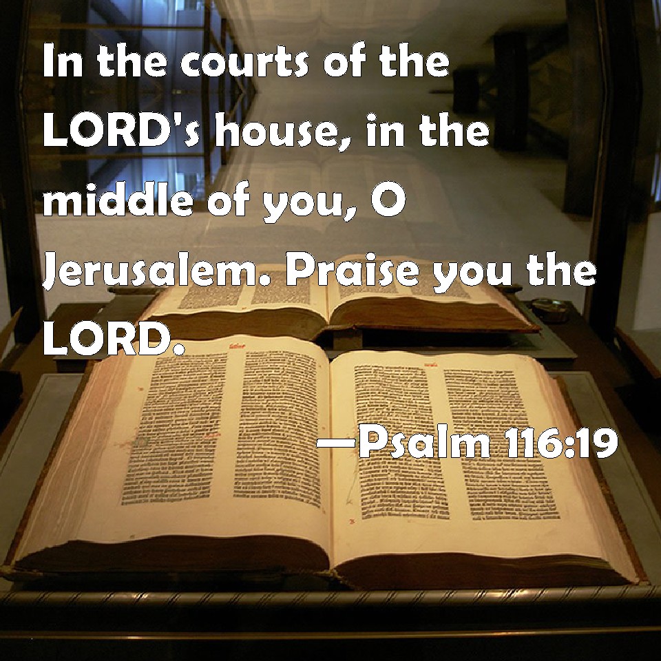 Choose a Background Psalm 116:19 In the courts of the LORD's house, in the middle of you, O Jerusalem. Praise you the LORD. KJV: In the courts of the LORD'S house, in the midst of thee, O Jerusalem. Praise ye the LORD. DRB: in the courts of the house of the Lord, in the midst of thee, O Jerusalem. DBT: In the courts of Jehovah's house, in the midst of thee, O Jerusalem. Hallelujah! ERV: In the courts of the LORD'S house, in the midst of thee, O Jerusalem. Praise ye the LORD. WBT: In the courts of the LORD'S house, in the midst of thee, O Jerusalem. Praise ye the LORD. WEB: in the courts of Yahweh's house, in the midst of you, Jerusalem. Praise Yah! YLT: In the courts of the house of Jehovah, In thy midst, O Jerusalem, praise ye Jah!Links Psalm 116:19 NIV • Psalm 116:19 NLT • Psalm 116:19 ESV • Psalm 116:19 NASB • Psalm 116:19 KJV • Psalm 116:19 Interlinear • Psalm 116:19 Commentaries • Psalm 116:19 Parallel Texts • Psalm 116:19 Bible Apps • Psalm 116:19 Parallel • Bible Hub |