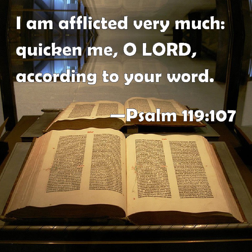 Choose a Background Psalm 119:107 I am afflicted very much: quicken me, O LORD, according to your word. KJV: I am afflicted very much: quicken me, O LORD, according unto thy word. DRB: I have been humbled, O Lord, exceedingly: quicken thou me according to thy word. DBT: I am afflicted very much; O Jehovah, quicken me according to thy word. ERV: I am afflicted very much: quicken me, O LORD, according unto thy word. WBT: I am afflicted very much: revive me, O LORD, according to thy word. WEB: I am afflicted very much. Revive me, Yahweh, according to your word. YLT: I have been afflicted very much, O Jehovah, quicken me, according to Thy word.Links Psalm 119:107 NIV • Psalm 119:107 NLT • Psalm 119:107 ESV • Psalm 119:107 NASB • Psalm 119:107 KJV • Psalm 119:107 Interlinear • Psalm 119:107 Commentaries • Psalm 119:107 Parallel Texts • Psalm 119:107 Bible Apps • Psalm 119:107 Parallel • Bible Hub |