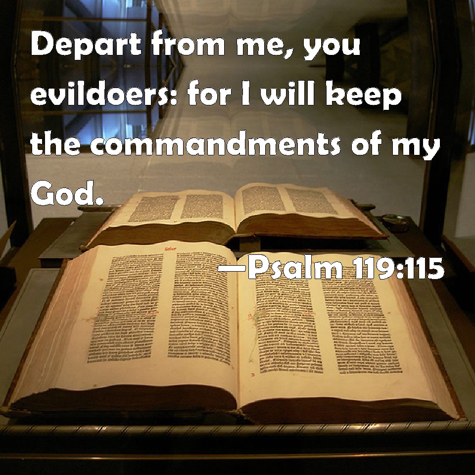 Choose a Background Psalm 119:115 Depart from me, you evildoers: for I will keep the commandments of my God. KJV: Depart from me, ye evildoers: for I will keep the commandments of my God. DRB: Depart from me, ye malignant: and I will search the commandments of my God. DBT: Depart from me, ye evil-doers; and I will observe the commandments of my God. ERV: Depart from me, ye evil-doers; that I may keep the commandments of my God. WBT: Depart from me, ye evil-doers: for I will keep the commandments of my God. WEB: Depart from me, you evildoers, that I may keep the commandments of my God. YLT: Turn aside from me, ye evil-doers, And I keep the commands of my God.Links Psalm 119:115 NIV • Psalm 119:115 NLT • Psalm 119:115 ESV • Psalm 119:115 NASB • Psalm 119:115 KJV • Psalm 119:115 Interlinear • Psalm 119:115 Commentaries • Psalm 119:115 Parallel Texts • Psalm 119:115 Bible Apps • Psalm 119:115 Parallel • Bible Hub |