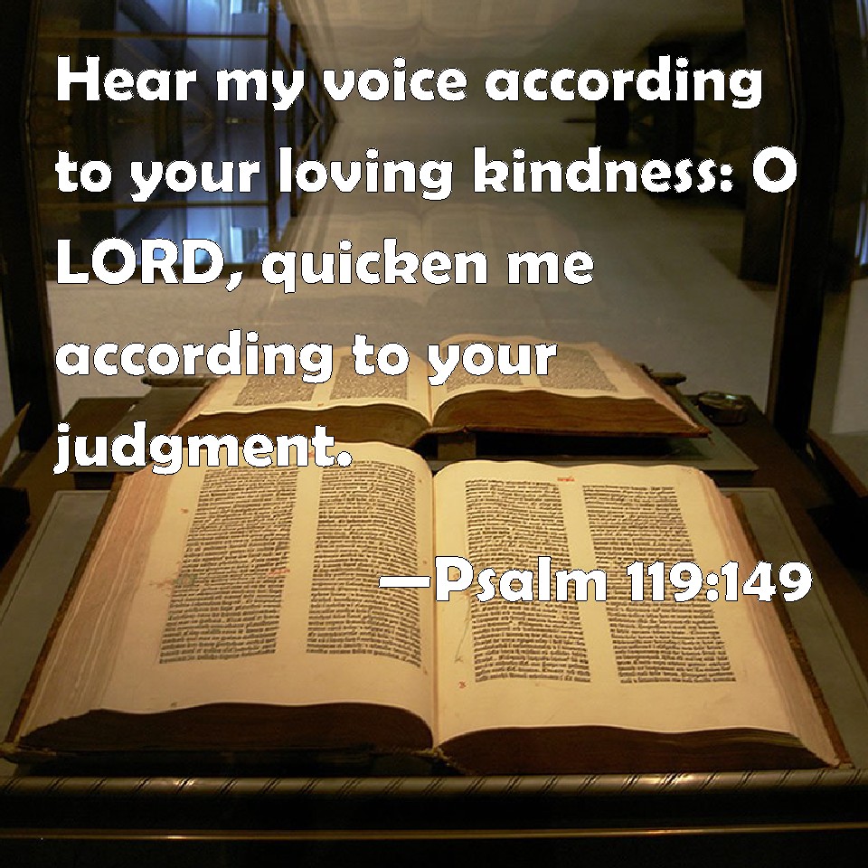 Choose a Background Psalm 119:149 Hear my voice according to your loving kindness: O LORD, quicken me according to your judgment. KJV: Hear my voice according unto thy lovingkindness: O LORD, quicken me according to thy judgment. DRB: Hear thou my voice, O Lord, according to thy mercy: and quicken me according to thy mercy. DBT: Hear my voice according to thy loving-kindness: O Jehovah, quicken me according to thy judgment. ERV: Hear my voice according unto thy lovingkindness: quicken me, O LORD, according to thy judgments. WBT: Hear my voice, according to thy loving-kindness: O LORD, revive me according to thy judgment. WEB: Hear my voice according to your loving kindness. Revive me, Yahweh, according to your ordinances. YLT: My voice hear, according to Thy kindness, Jehovah, according to Thy judgment quicken me.Links Psalm 119:149 NIV • Psalm 119:149 NLT • Psalm 119:149 ESV • Psalm 119:149 NASB • Psalm 119:149 KJV • Psalm 119:149 Interlinear • Psalm 119:149 Commentaries • Psalm 119:149 Parallel Texts • Psalm 119:149 Bible Apps • Psalm 119:149 Parallel • Bible Hub |