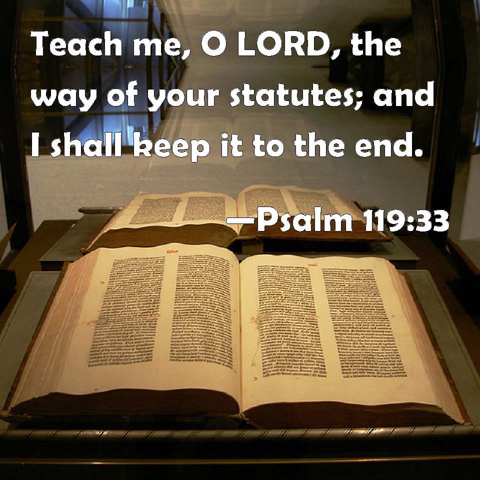 Choose a Background Psalm 119:33 Teach me, O LORD, the way of your statutes; and I shall keep it to the end. KJV: HE. Teach me, O LORD, the way of thy statutes; and I shall keep it unto the end. DRB: [HE] Set before me for a law the way of thy justifications, O Lord: and I will always seek after it. DBT: HE. Teach me, O Jehovah, the way of thy statutes, and I will observe it unto the end. ERV: HE. Teach me, O LORD, the way of thy statutes; and I shall keep it unto the end. WBT: HE. Teach me, O LORD, the way of thy statutes; and I shall keep it to the end. WEB: Teach me, Yahweh, the way of your statutes. I will keep them to the end. YLT: He. Show me, O Jehovah, the way of Thy statutes, And I keep it — to the end.Links Psalm 119:33 NIV • Psalm 119:33 NLT • Psalm 119:33 ESV • Psalm 119:33 NASB • Psalm 119:33 KJV • Psalm 119:33 Interlinear • Psalm 119:33 Commentaries • Psalm 119:33 Parallel Texts • Psalm 119:33 Bible Apps • Psalm 119:33 Parallel • Bible Hub |