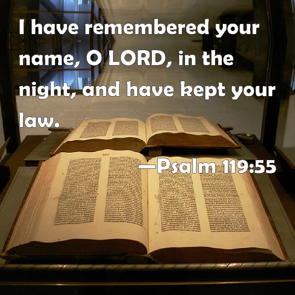 Choose a Background Psalm 119:55 I have remembered your name, O LORD, in the night, and have kept your law. KJV: I have remembered thy name, O LORD, in the night, and have kept thy law. DRB: In the night I have remembered thy name, O Lord: and have kept thy law. DBT: I have remembered thy name, O Jehovah, in the night, and have kept thy law. ERV: I have remembered thy name, O LORD, in the night, and have observed thy law. WBT: I have remembered thy name, O LORD, in the night, and have kept thy law. WEB: I have remembered your name, Yahweh, in the night, and I obey your law. YLT: I have remembered in the night Thy name, O Jehovah, And I do keep Thy law.Links Psalm 119:55 NIV • Psalm 119:55 NLT • Psalm 119:55 ESV • Psalm 119:55 NASB • Psalm 119:55 KJV • Psalm 119:55 Interlinear • Psalm 119:55 Commentaries • Psalm 119:55 Parallel Texts • Psalm 119:55 Bible Apps • Psalm 119:55 Parallel • Bible Hub |