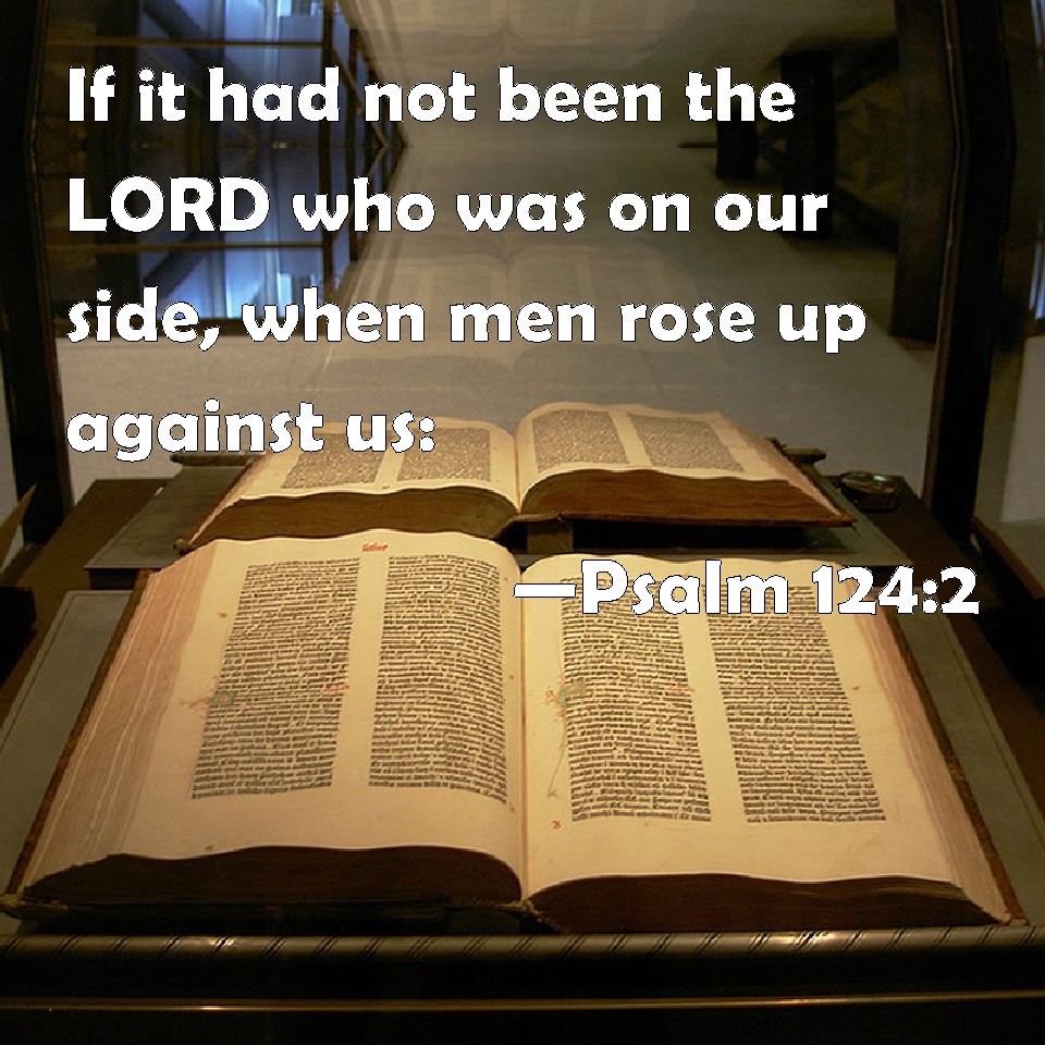 Choose a Background Psalm 124:2 If it had not been the LORD who was on our side, when men rose up against us: KJV: If it had not been the LORD who was on our side, when men rose up against us: DRB: If it had not been that the Lord was with us, When men rose up against us DBT: If it had not been Jehovah who was for us, when men rose up against us, ERV: If it had not been the LORD who was on our side, when men rose up against us: WBT: If it had not been the LORD who was on our side, when men rose up against us: WEB: if it had not been Yahweh who was on our side, when men rose up against us; YLT: Save for Jehovah — who hath been for us, In the rising up of man against us,Links Psalm 124:2 NIV • Psalm 124:2 NLT • Psalm 124:2 ESV • Psalm 124:2 NASB • Psalm 124:2 KJV • Psalm 124:2 Interlinear • Psalm 124:2 Commentaries • Psalm 124:2 Parallel Texts • Psalm 124:2 Bible Apps • Psalm 124:2 Parallel • Bible Hub |