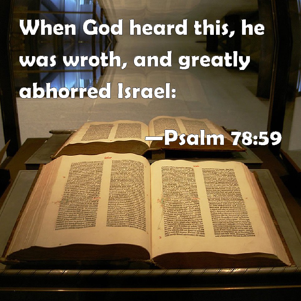 Choose a Background Psalm 78:59 When God heard this, he was wroth, and greatly abhorred Israel: KJV: When God heard this, he was wroth, and greatly abhorred Israel: DRB: God heard, and despised them, and he reduced Israel exceedingly as it were to nothing. DBT: God heard, and was wroth, and greatly abhorred Israel: ERV: When God heard this, he was wroth, and greatly abhorred Israel: WBT: When God heard this, he was wroth, and greatly abhorred Israel: WEB: When God heard this, he was angry, and greatly abhorred Israel; YLT: God hath heard, and sheweth Himself wroth. And kicketh exceedingly against Israel.Links Psalm 78:59 NIV • Psalm 78:59 NLT • Psalm 78:59 ESV • Psalm 78:59 NASB • Psalm 78:59 KJV • Psalm 78:59 Interlinear • Psalm 78:59 Commentaries • Psalm 78:59 Parallel Texts • Psalm 78:59 Bible Apps • Psalm 78:59 Parallel • Bible Hub |