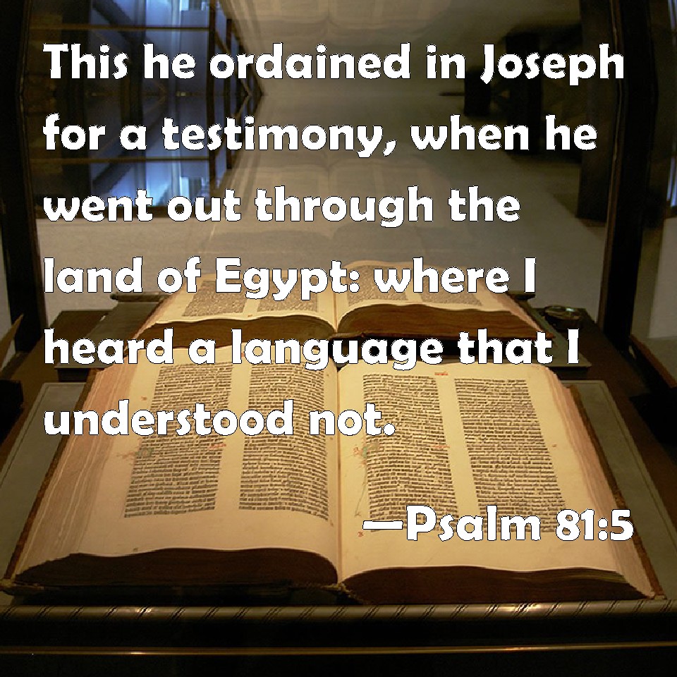 Choose a Background Psalm 81:5 This he ordained in Joseph for a testimony, when he went out through the land of Egypt: where I heard a language that I understood not. KJV: This he ordained in Joseph for a testimony, when he went out through the land of Egypt: where I heard a language that I understood not. DRB: He ordained it for a testimony in Joseph, when he came out of the land of Egypt: he heard a tongue which he knew not. DBT: He ordained it in Joseph for a testimony, when he went forth over the land of Egypt, where I heard a language that I knew not. ERV: He appointed it in Joseph for testimony, when he went out over the land of Egypt: where I heard a language that I knew not. WBT: This he ordained in Joseph for a testimony, when he went out through the land of Egypt: where I heard a language that I understood not. WEB: He appointed it in Joseph for a testimony, when he went out over the land of Egypt, I heard a language that I didn't know. YLT: A testimony on Joseph He hath placed it, In his going forth over the land of Egypt. A lip, I have not known — I hear.Links Psalm 81:5 NIV • Psalm 81:5 NLT • Psalm 81:5 ESV • Psalm 81:5 NASB • Psalm 81:5 KJV • Psalm 81:5 Interlinear • Psalm 81:5 Commentaries • Psalm 81:5 Parallel Texts • Psalm 81:5 Bible Apps • Psalm 81:5 Parallel • Bible Hub |