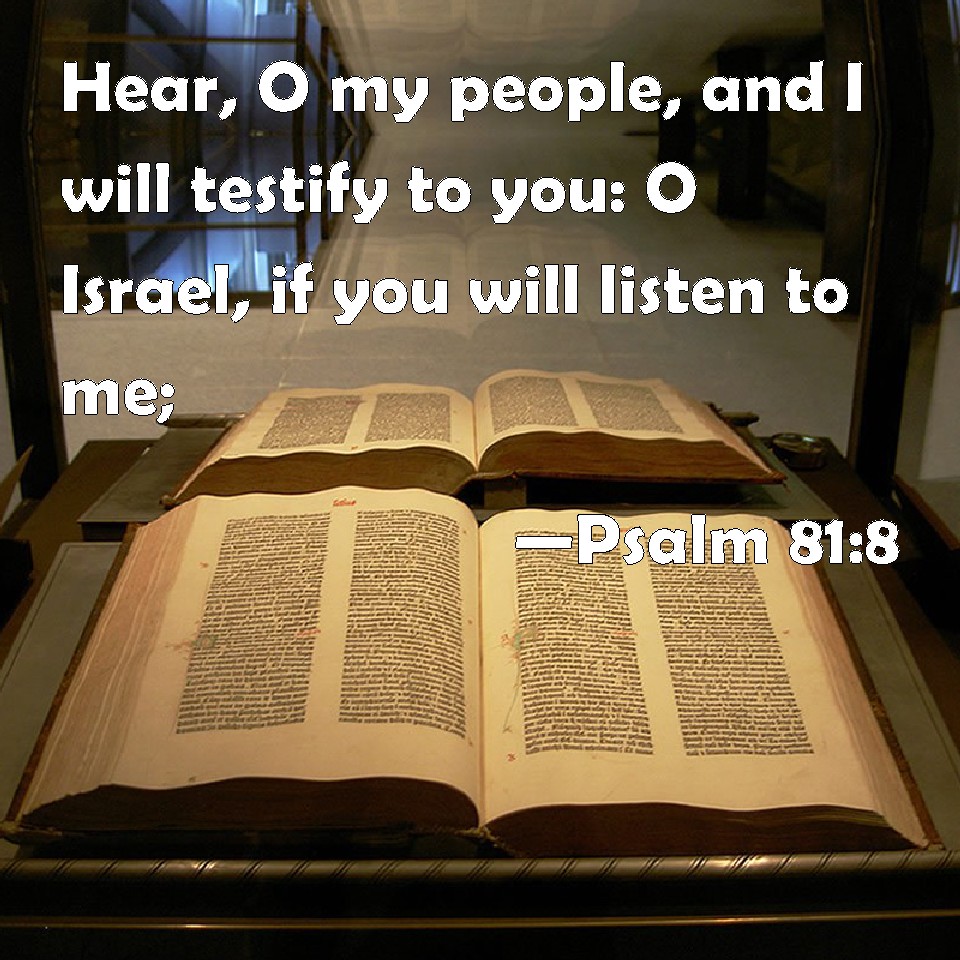 Choose a Background Psalm 81:8 Hear, O my people, and I will testify to you: O Israel, if you will listen to me; KJV: Hear, O my people, and I will testify unto thee: O Israel, if thou wilt hearken unto me; DRB: Hear, O my people, and I will testify to thee: O Israel, if thou wilt hearken to me, DBT: Hear, my people, and I will testify unto thee; O Israel, if thou wouldest hearken unto me! ERV: Hear, O my people, and I will testify unto thee: O Israel, if thou wouldest hearken unto me! WBT: Hear, O my people, and I will testify to thee; O Israel, if thou wilt hearken to me; WEB: "Hear, my people, and I will testify to you, Israel, if you would listen to me! YLT: Hear, O My people, and I testify to thee, O Israel, if thou dost hearken to me:Links Psalm 81:8 NIV • Psalm 81:8 NLT • Psalm 81:8 ESV • Psalm 81:8 NASB • Psalm 81:8 KJV • Psalm 81:8 Interlinear • Psalm 81:8 Commentaries • Psalm 81:8 Parallel Texts • Psalm 81:8 Bible Apps • Psalm 81:8 Parallel • Bible Hub |