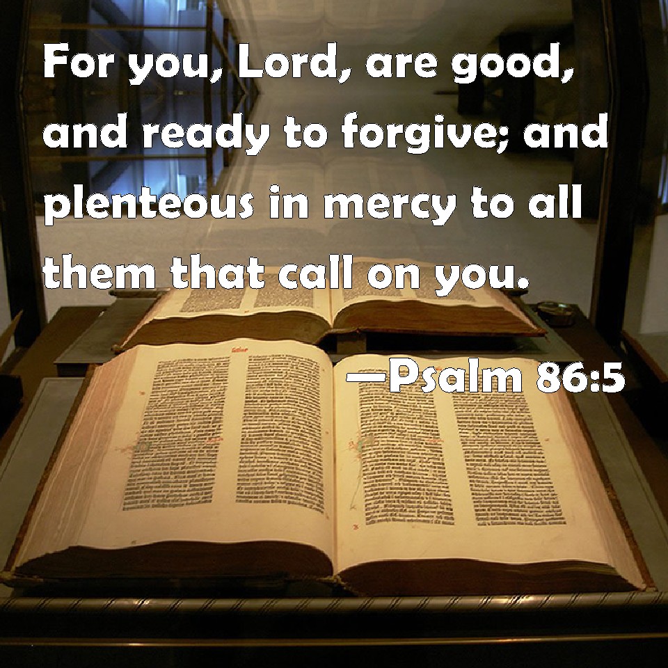Choose a Background Psalm 86:5 For you, Lord, are good, and ready to forgive; and plenteous in mercy to all them that call on you. KJV: For thou, Lord, art good, and ready to forgive; and plenteous in mercy unto all them that call upon thee. DRB: For thou, O Lord, art sweet and mild: and plenteous in mercy to all that call upon thee. DBT: For thou, Lord, art good, and ready to forgive, and art of great loving-kindness unto all that call upon thee. ERV: For thou, Lord, art good, and ready to forgive, and plenteous in mercy unto all them that call upon thee. WBT: For thou, Lord, art good, and ready to forgive; and abundant in mercy to all them that call upon thee. WEB: For you, Lord, are good, and ready to forgive; abundant in loving kindness to all those who call on you. YLT: For Thou, Lord, art good and forgiving. And abundant in kindness to all calling Thee.Links Psalm 86:5 NIV • Psalm 86:5 NLT • Psalm 86:5 ESV • Psalm 86:5 NASB • Psalm 86:5 KJV • Psalm 86:5 Interlinear • Psalm 86:5 Commentaries • Psalm 86:5 Parallel Texts • Psalm 86:5 Bible Apps • Psalm 86:5 Parallel • Bible Hub |