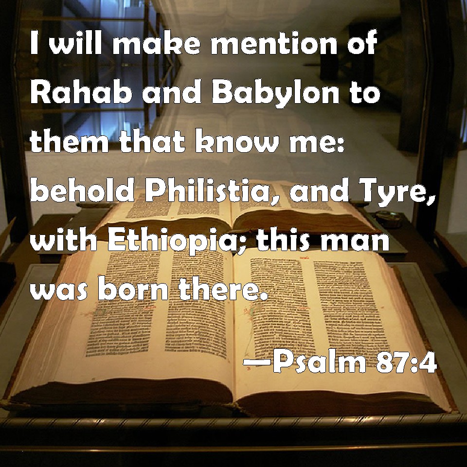 Choose a Background Psalm 87:4 I will make mention of Rahab and Babylon to them that know me: behold Philistia, and Tyre, with Ethiopia; this man was born there. KJV: I will make mention of Rahab and Babylon to them that know me: behold Philistia, and Tyre, with Ethiopia; this man was born there. DRB: I will be mindful of Rahab and of Babylon knowing me. Behold the foreigners, and Tyre, and the people of the Ethiopians, these were there. DBT: I will make mention of Rahab and Babylon among them thatknow me; behold Philistia, and Tyre, with Ethiopia: this man was born there. ERV: I will make mention of Rahab and Babylon as among them that know me: behold Philistia, and Tyre, with Ethiopia; this one was born there. WBT: I will make mention of Rahab and Babylon to them that know me: behold Philistia, and Tyre, with Cush; this man was born there. WEB: I will record Rahab and Babylon among those who acknowledge me. Behold, Philistia, Tyre, and also Ethiopia: "This one was born there." YLT: I mention Rahab and Babel to those knowing Me, Lo, Philistia, and Tyre, with Cush! This one was born there.Links Psalm 87:4 NIV • Psalm 87:4 NLT • Psalm 87:4 ESV • Psalm 87:4 NASB • Psalm 87:4 KJV • Psalm 87:4 Interlinear • Psalm 87:4 Commentaries • Psalm 87:4 Parallel Texts • Psalm 87:4 Bible Apps • Psalm 87:4 Parallel • Bible Hub |