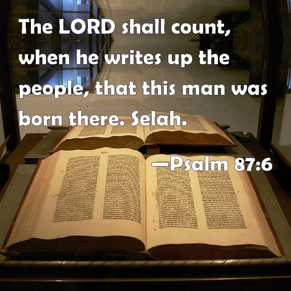 Choose a Background Psalm 87:6 The LORD shall count, when he writes up the people, that this man was born there. Selah. KJV: The LORD shall count, when he writeth up the people, that this man was born there. Selah. DRB: The Lord shall tell in his writings of peoples and of princes, of them that have been in her. DBT: Jehovah will count, when he inscribeth the peoples, This man was born there. Selah. ERV: The LORD shall count, when he writeth up the peoples, this one was born there. Selah WBT: The LORD shall count, when he writeth up the people, that this man was born there. Selah. WEB: Yahweh will count, when he writes up the peoples, "This one was born there." Selah. YLT: Jehovah doth recount in the describing of the peoples, 'This one was born there.' Selah.Links Psalm 87:6 NIV • Psalm 87:6 NLT • Psalm 87:6 ESV • Psalm 87:6 NASB • Psalm 87:6 KJV • Psalm 87:6 Interlinear • Psalm 87:6 Commentaries • Psalm 87:6 Parallel Texts • Psalm 87:6 Bible Apps • Psalm 87:6 Parallel • Bible Hub |