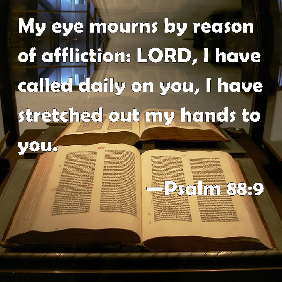 Choose a Background Psalm 88:9 My eye mourns by reason of affliction: LORD, I have called daily on you, I have stretched out my hands to you. KJV: Mine eye mourneth by reason of affliction: LORD, I have called daily upon thee, I have stretched out my hands unto thee. DRB: my eyes languished through poverty. All the day I cried to thee, O Lord: I stretched out my hands to thee. DBT: Mine eye consumeth by reason of affliction. Upon thee, Jehovah, have I called every day; I have stretched out my hands unto thee. ERV: Mine eye wasteth away by reason of affliction: I have called daily upon thee, O LORD, I have spread forth my hands unto thee. WBT: My eye mourneth by reason of affliction: LORD, I have called daily upon thee, I have stretched out my hands to thee. WEB: My eyes are dim from grief. I have called on you daily, Yahweh. I have spread out my hands to you. YLT: Mine eye hath grieved because of affliction, I called Thee, O Jehovah, all the day, I have spread out unto Thee my hands.Links Psalm 88:9 NIV • Psalm 88:9 NLT • Psalm 88:9 ESV • Psalm 88:9 NASB • Psalm 88:9 KJV • Psalm 88:9 Interlinear • Psalm 88:9 Commentaries • Psalm 88:9 Parallel Texts • Psalm 88:9 Bible Apps • Psalm 88:9 Parallel • Bible Hub |