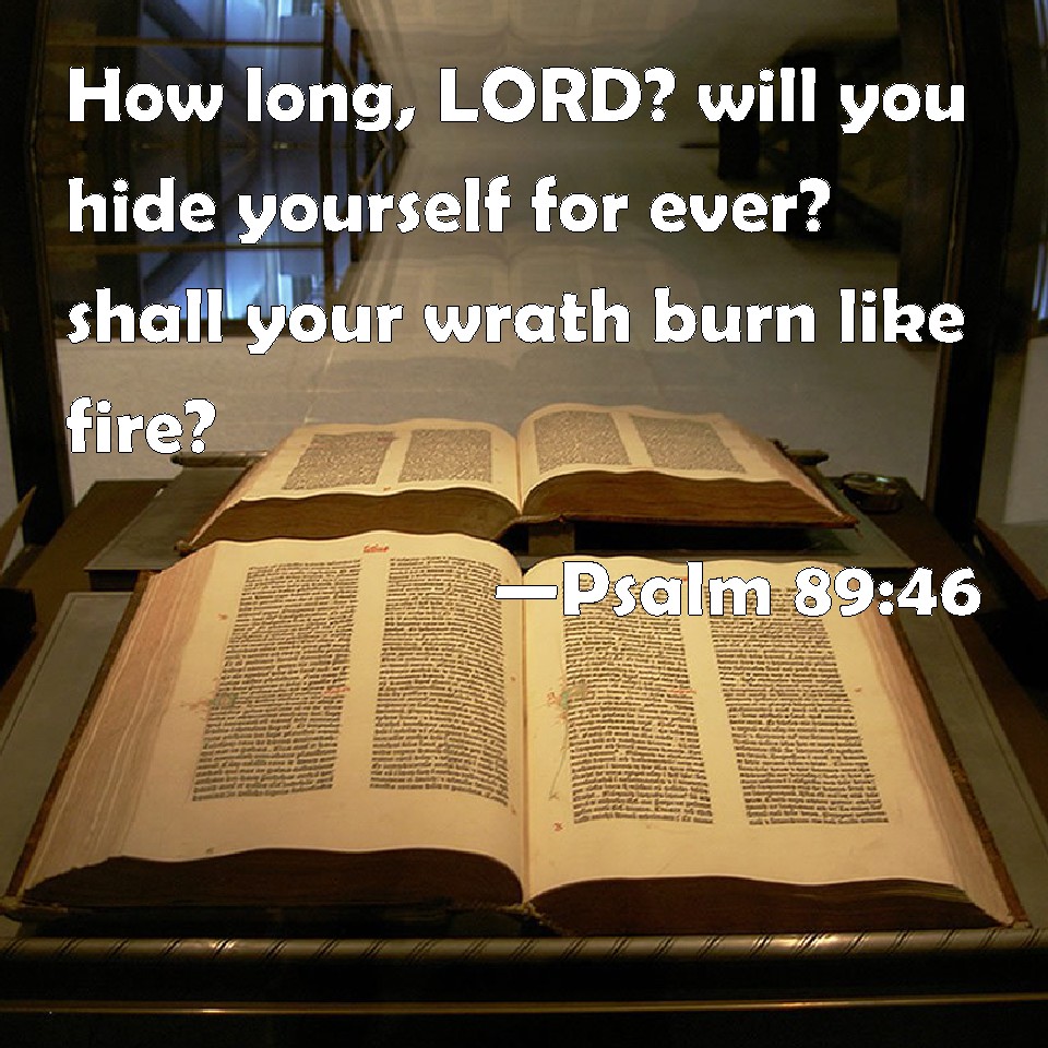 Choose a Background Psalm 89:46 How long, LORD? will you hide yourself for ever? shall your wrath burn like fire? KJV: How long, LORD? wilt thou hide thyself for ever? shall thy wrath burn like fire? DRB: How long, O Lord, turnest thou away unto the end? shall thy anger burn like fire? DBT: How long, Jehovah, wilt thou hide thyself for ever? shall thy fury burn like fire? ERV: How long, O LORD, wilt thou hid thyself for ever? how long shall thy wrath burn like fire? WBT: How long, LORD, wilt thou hide thyself? for ever? shall thy wrath burn like fire? WEB: How long, Yahweh? Will you hide yourself forever? Will your wrath burn like fire? YLT: Till when, O Jehovah, art Thou hidden? For ever doth Thy fury burn as fire?Links Psalm 89:46 NIV • Psalm 89:46 NLT • Psalm 89:46 ESV • Psalm 89:46 NASB • Psalm 89:46 KJV • Psalm 89:46 Interlinear • Psalm 89:46 Commentaries • Psalm 89:46 Parallel Texts • Psalm 89:46 Bible Apps • Psalm 89:46 Parallel • Bible Hub |