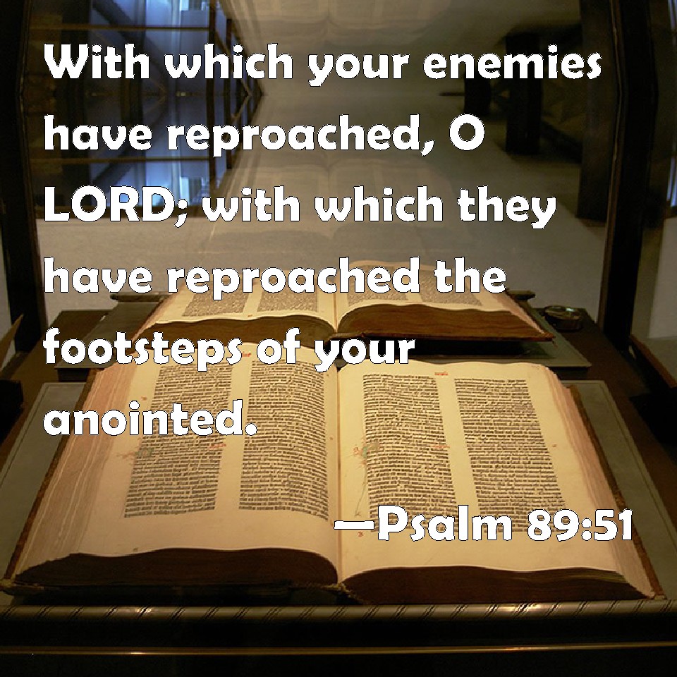 Choose a Background Psalm 89:51 With which your enemies have reproached, O LORD; with which they have reproached the footsteps of your anointed. KJV: Wherewith thine enemies have reproached, O LORD; wherewith they have reproached the footsteps of thine anointed. DRB: Wherewith thy enemies have reproached, O Lord; wherewith they have reproached the change of thy anointed. DBT: Wherewith thine enemies, O Jehovah, have reproached, wherewith they have reproached the footsteps of thine anointed. ERV: Wherewith thine enemies have reproached, O LORD, wherewith they have reproached the footsteps of thine anointed. WBT: With which thy enemies have reproached, O LORD; with which they have reproached the footsteps of thy anointed WEB: With which your enemies have mocked, Yahweh, with which they have mocked the footsteps of your anointed one. YLT: Wherewith Thine enemies reproached, O Jehovah, Wherewith they have reproached The steps of Thine anointed.Links Psalm 89:51 NIV • Psalm 89:51 NLT • Psalm 89:51 ESV • Psalm 89:51 NASB • Psalm 89:51 KJV • Psalm 89:51 Interlinear • Psalm 89:51 Commentaries • Psalm 89:51 Parallel Texts • Psalm 89:51 Bible Apps • Psalm 89:51 Parallel • Bible Hub |