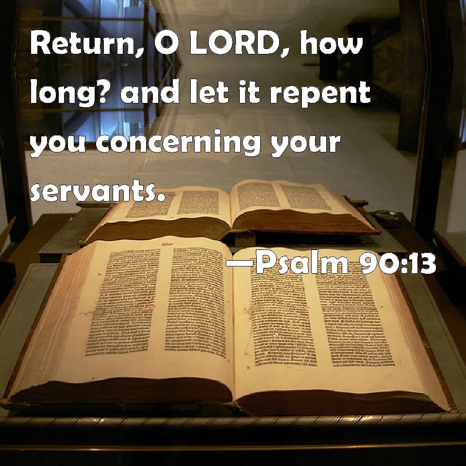 Choose a Background Psalm 90:13 Return, O LORD, how long? and let it repent you concerning your servants. KJV: Return, O LORD, how long? and let it repent thee concerning thy servants. DRB: Return, O Lord, how long? and be entreated in favour of thy servants. DBT: Return, Jehovah: how long? and let it repent thee concerning thy servants. ERV: Return, O LORD; how long? and let it repent thee concerning thy servants. WBT: Return, O LORD, how long? and repent thou concerning thy servants. WEB: Relent, Yahweh! How long? Have compassion on your servants! YLT: Turn back, O Jehovah, till when? And repent concerning Thy servants.Links Psalm 90:13 NIV • Psalm 90:13 NLT • Psalm 90:13 ESV • Psalm 90:13 NASB • Psalm 90:13 KJV • Psalm 90:13 Interlinear • Psalm 90:13 Commentaries • Psalm 90:13 Parallel Texts • Psalm 90:13 Bible Apps • Psalm 90:13 Parallel • Bible Hub |