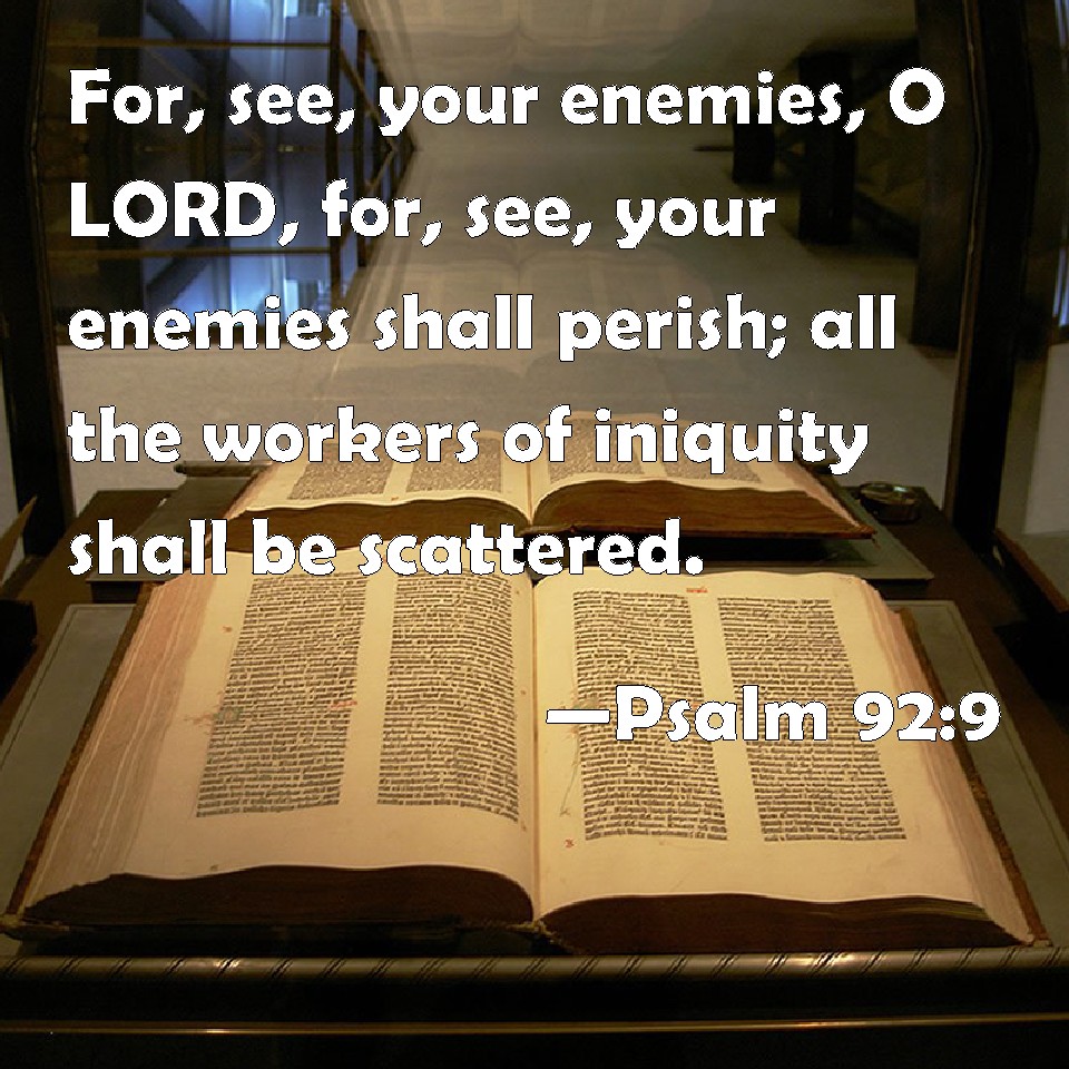 Choose a Background Psalm 92:9 For, see, your enemies, O LORD, for, see, your enemies shall perish; all the workers of iniquity shall be scattered. KJV: For, lo, thine enemies, O LORD, for, lo, thine enemies shall perish; all the workers of iniquity shall be scattered. DRB: For behold thy enemies, O Lord, for behold thy enemies shall perish: and all the workers of iniquity shall be scattered. DBT: For lo, thine enemies, O Jehovah, for lo, thine enemies shall perish; all the workers of iniquity shall be scattered. ERV: For, lo, thine enemies, O LORD, for, lo, thine enemies shall perish; all the workers of iniquity shall be scattered. WBT: For lo, thy enemies, O LORD, for lo, thy enemies shall perish; all the workers of iniquity shall be scattered. WEB: For, behold, your enemies, Yahweh, for, behold, your enemies shall perish. All the evildoers will be scattered. YLT: For, lo, Thine enemies, O Jehovah, For, lo, Thine enemies, do perish, Separate themselves do all workers of iniquity.Links Psalm 92:9 NIV • Psalm 92:9 NLT • Psalm 92:9 ESV • Psalm 92:9 NASB • Psalm 92:9 KJV • Psalm 92:9 Interlinear • Psalm 92:9 Commentaries • Psalm 92:9 Parallel Texts • Psalm 92:9 Bible Apps • Psalm 92:9 Parallel • Bible Hub |