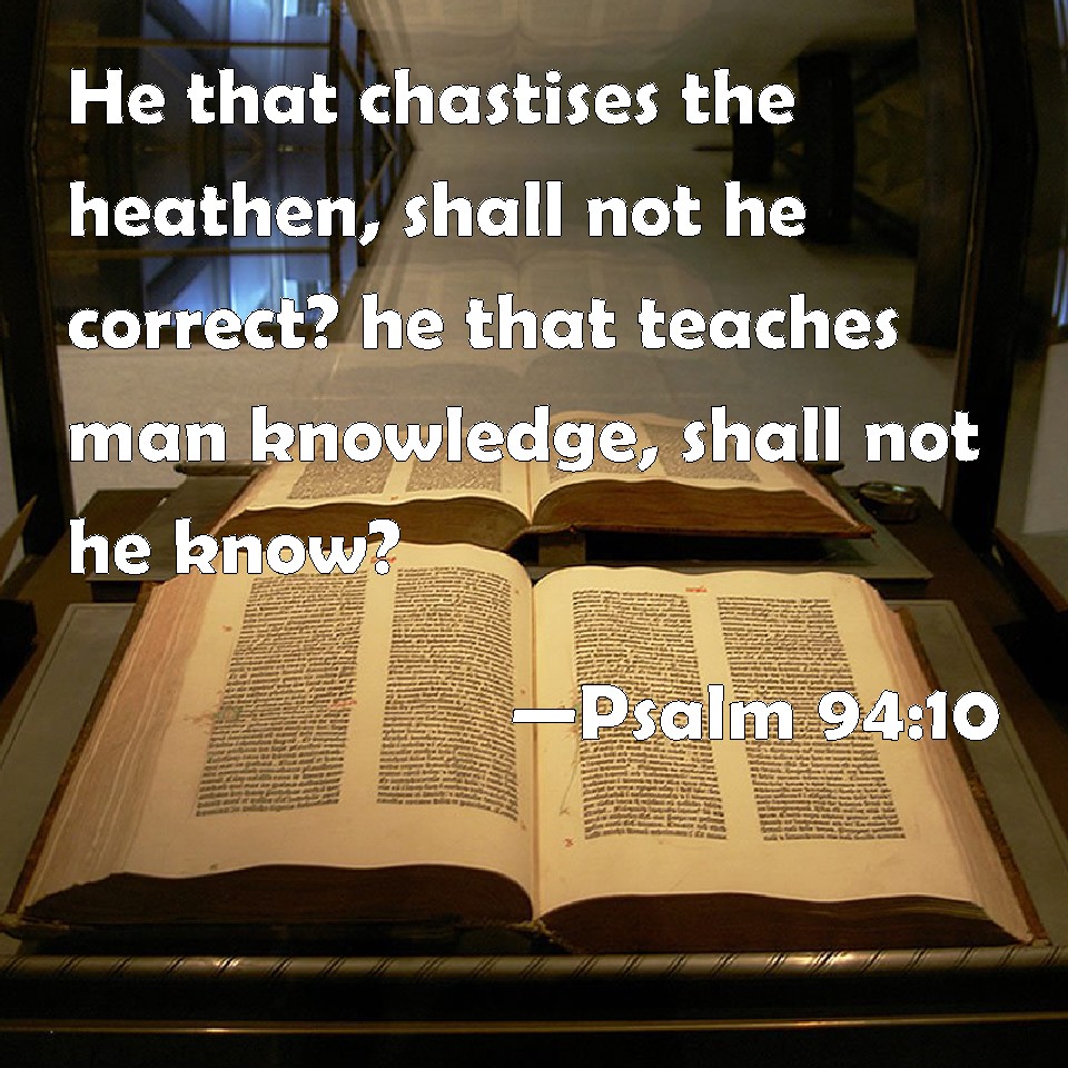 Choose a Background Psalm 94:10 He that chastises the heathen, shall not he correct? he that teaches man knowledge, shall not he know? KJV: He that chastiseth the heathen, shall not he correct? he that teacheth man knowledge, shall not he know? DRB: He that chastiseth nations, shall he not rebuke: he that teacheth man knowledge? DBT: He that instructeth the nations, shall not he correct he that teacheth man knowledge? ERV: He that chastiseth the nations, shall not he correct, even he that teacheth man knowledge? WBT: He that chastiseth the heathen, shall he not correct? he that teacheth man knowledge, shall he not know? WEB: He who disciplines the nations, won't he punish? He who teaches man knows. YLT: He who is instructing nations, Doth He not reprove? He who is teaching man knowledge is Jehovah.Links Psalm 94:10 NIV • Psalm 94:10 NLT • Psalm 94:10 ESV • Psalm 94:10 NASB • Psalm 94:10 KJV • Psalm 94:10 Interlinear • Psalm 94:10 Commentaries • Psalm 94:10 Parallel Texts • Psalm 94:10 Bible Apps • Psalm 94:10 Parallel • Bible Hub |