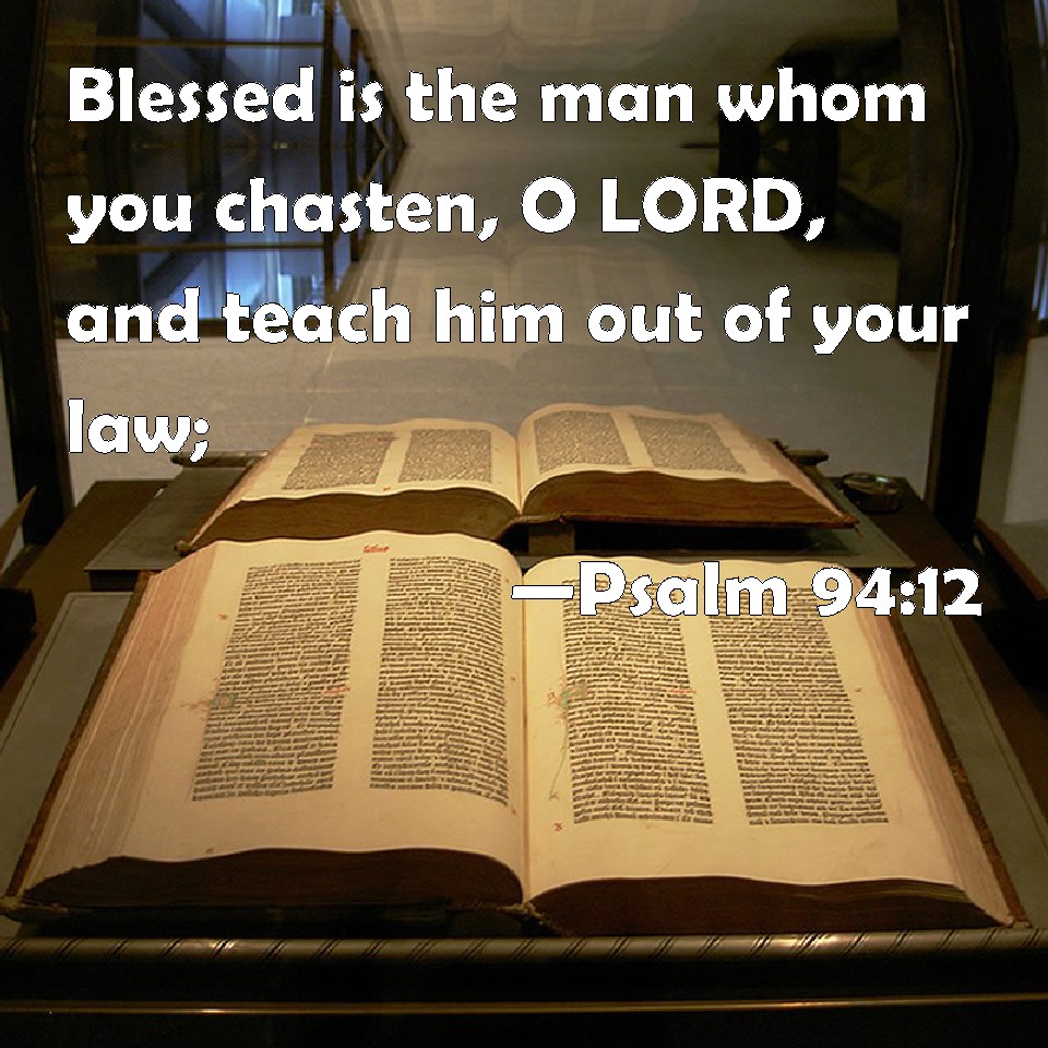 Choose a Background Psalm 94:12 Blessed is the man whom you chasten, O LORD, and teach him out of your law; KJV: Blessed is the man whom thou chastenest, O LORD, and teachest him out of thy law; DRB: Blessed is the man whom thou shalt instruct, O Lord: and shalt teach him out of thy law. DBT: Blessed is the man whom thou chastenest, O Jah, and whom thou teachest out of thy law; ERV: Blessed is the man whom thou chastenest, O LORD, and teachest out of thy law; WBT: Blessed is the man whom thou chastenest, O LORD, and teachest him out of thy law; WEB: Blessed is the man whom you discipline, Yah, and teach out of your law; YLT: O the happiness of the man Whom Thou instructest, O Jah, And out of Thy law teachest him,Links Psalm 94:12 NIV • Psalm 94:12 NLT • Psalm 94:12 ESV • Psalm 94:12 NASB • Psalm 94:12 KJV • Psalm 94:12 Interlinear • Psalm 94:12 Commentaries • Psalm 94:12 Parallel Texts • Psalm 94:12 Bible Apps • Psalm 94:12 Parallel • Bible Hub |