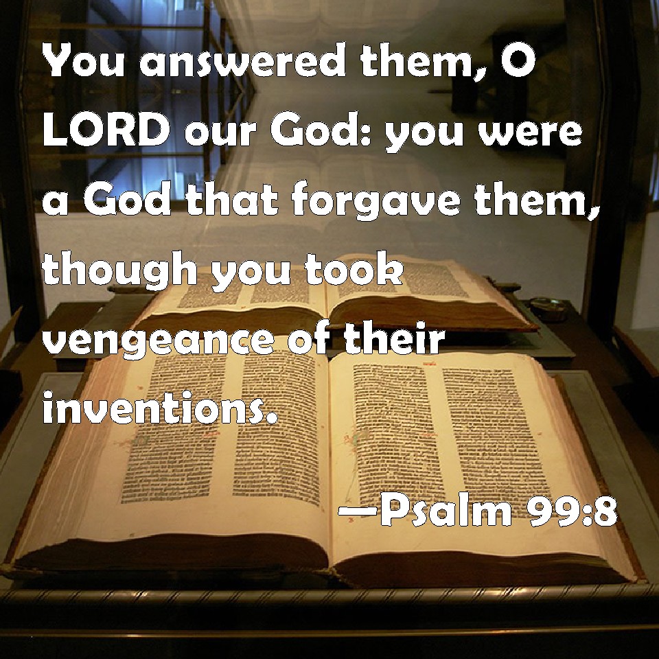 Choose a Background Psalm 99:8 You answered them, O LORD our God: you were a God that forgave them, though you took vengeance of their inventions. KJV: Thou answeredst them, O LORD our God: thou wast a God that forgavest them, though thou tookest vengeance of their inventions. DRB: Thou didst hear them, O Lord our God: thou wast a merciful God to them, and taking vengeance on all their inventions. DBT: Jehovah, our God, thou answeredst them: a forgiving God wast thou unto them, though thou tookest vengeance of their doings. ERV: Thou answeredst them, O LORD our God: thou wast a God that forgavest them, though thou tookest vengeance of their doings. WBT: Thou didst answer them, O LORD our God: thou wast a God that forgavest them, though thou tookest vengeance of their inventions. WEB: You answered them, Yahweh our God. You are a God who forgave them, although you took vengeance for their doings. YLT: O Jehovah, our God, Thou hast afflicted them, A God forgiving Thou hast been to them, And taking vengeance on their actions.Links Psalm 99:8 NIV • Psalm 99:8 NLT • Psalm 99:8 ESV • Psalm 99:8 NASB • Psalm 99:8 KJV • Psalm 99:8 Interlinear • Psalm 99:8 Commentaries • Psalm 99:8 Parallel Texts • Psalm 99:8 Bible Apps • Psalm 99:8 Parallel • Bible Hub |