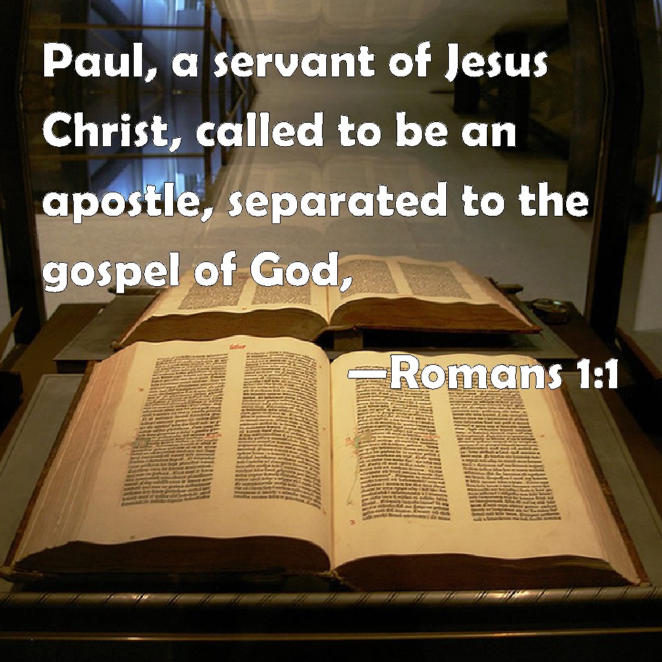 Choose a Background Romans 1:1 Paul, a servant of Jesus Christ, called to be an apostle, separated to the gospel of God, KJV: Paul, a servant of Jesus Christ, called to be an apostle, separated unto the gospel of God, DRB: PAUL, a servant of Jesus Christ, called to be an apostle, separated unto the gospel of God, DBT: Paul, bondman of Jesus Christ, a called apostle, separated to God's glad tidings, ERV: Paul, a servant of Jesus Christ, called to be an apostle, separated unto the gospel of God, WBT: Paul, a servant of Jesus Christ, called to be an apostle, separated to the gospel of God, WEB: Paul, a servant of Jesus Christ, called to be an apostle, set apart for the Good News of God, YLT: Paul, a servant of Jesus Christ, a called apostle, having been separated to the good news of God — Links Romans 1:1 NIV • Romans 1:1 NLT • Romans 1:1 ESV • Romans 1:1 NASB • Romans 1:1 KJV • Romans 1:1 Interlinear • Romans 1:1 Commentaries • Romans 1:1 Parallel Texts • Romans 1:1 Bible Apps • Romans 1:1 Parallel • Bible Hub |