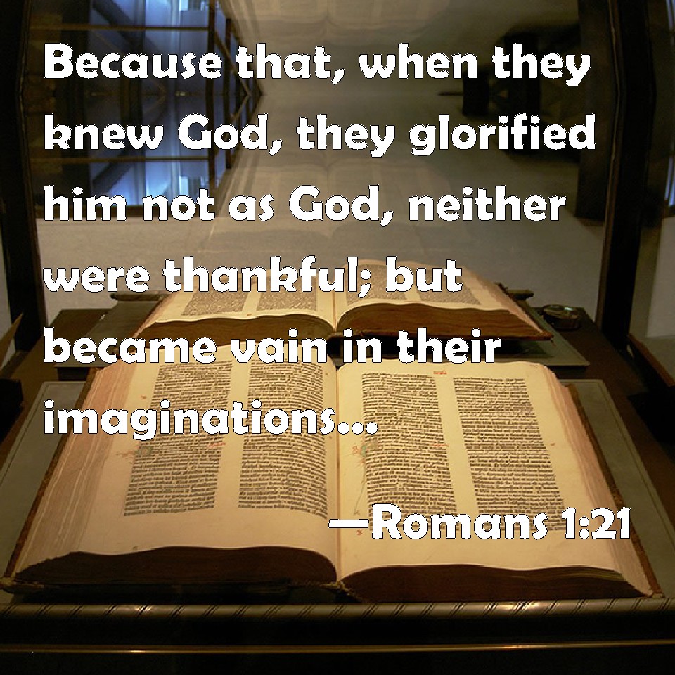 Choose a Background Romans 1:21 Because that, when they knew God, they glorified him not as God, neither were thankful; but became vain in their imaginations, and their foolish heart was darkened. KJV: Because that, when they knew God, they glorified him not as God, neither were thankful; but became vain in their imaginations, and their foolish heart was darkened. DRB: Because that, when they knew God, they have not glorified him as God, or given thanks; but became vain in their thoughts, and their foolish heart was darkened. DBT: Because, knowing God, they glorified him not as God, neither were thankful; but fell into folly in their thoughts, and their heart without understanding was darkened: ERV: because that, knowing God, they glorified him not as God, neither gave thanks; but became vain in their reasonings, and their senseless heart was darkened. WBT: Because that when they knew God, they glorified him not as God, neither were thankful, but became vain in their imaginations, and their foolish heart was darkened. WEB: Because, knowing God, they didn't glorify him as God, neither gave thanks, but became vain in their reasoning, and their senseless heart was darkened. YLT: because, having known God they did not glorify Him as God, nor gave thanks, but were made vain in their reasonings, and their unintelligent heart was darkened,Links Romans 1:21 NIV • Romans 1:21 NLT • Romans 1:21 ESV • Romans 1:21 NASB • Romans 1:21 KJV • Romans 1:21 Interlinear • Romans 1:21 Commentaries • Romans 1:21 Parallel Texts • Romans 1:21 Bible Apps • Romans 1:21 Parallel • Bible Hub |