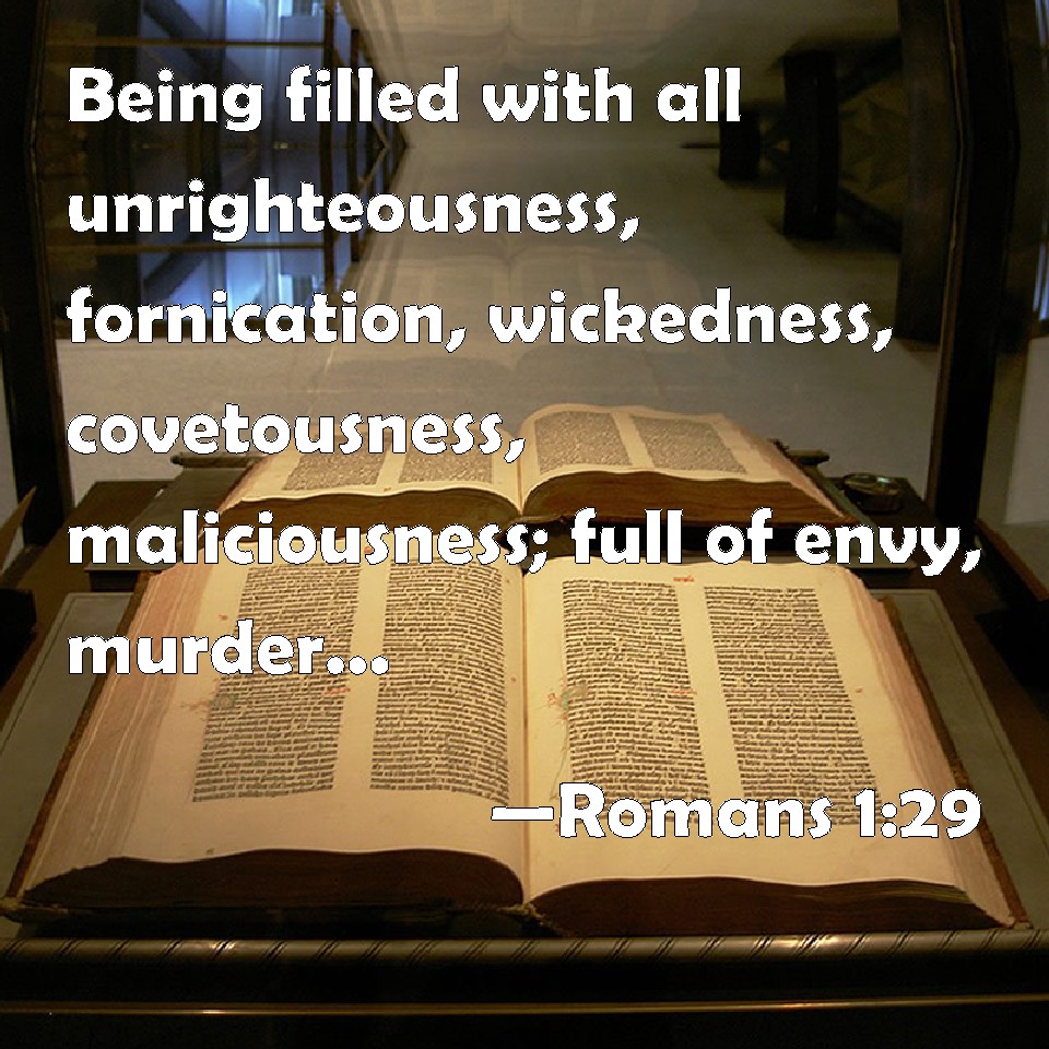 Choose a Background Romans 1:29 Being filled with all unrighteousness, fornication, wickedness, covetousness, maliciousness; full of envy, murder, debate, deceit, malignity; whisperers, KJV: Being filled with all unrighteousness, fornication, wickedness, covetousness, maliciousness; full of envy, murder, debate, deceit, malignity; whisperers, DRB: Being filled with all iniquity, malice, fornication, avarice, wickedness, full of envy, murder, contention, deceit, malignity, whisperers, DBT: being filled with all unrighteousness, wickedness, covetousness, malice; full of envy, murder, strife, deceit, evil dispositions; whisperers, ERV: being filled with all unrighteousness, wickedness, covetousness, maliciousness; full of envy, murder, strife, deceit, malignity; whisperers, WBT: Being filled with all unrighteousness, fornication, wickedness, covetousness, maliciousness; full of envy, murder, debate, deceit, malignity; whisperers, WEB: being filled with all unrighteousness, sexual immorality, wickedness, covetousness, malice; full of envy, murder, strife, deceit, evil habits, secret slanderers, YLT: having been filled with all unrighteousness, whoredom, wickedness, covetousness, malice; full of envy, murder, strife, deceit, evil dispositions; whisperers,Links Romans 1:29 NIV • Romans 1:29 NLT • Romans 1:29 ESV • Romans 1:29 NASB • Romans 1:29 KJV • Romans 1:29 Interlinear • Romans 1:29 Commentaries • Romans 1:29 Parallel Texts • Romans 1:29 Bible Apps • Romans 1:29 Parallel • Bible Hub |