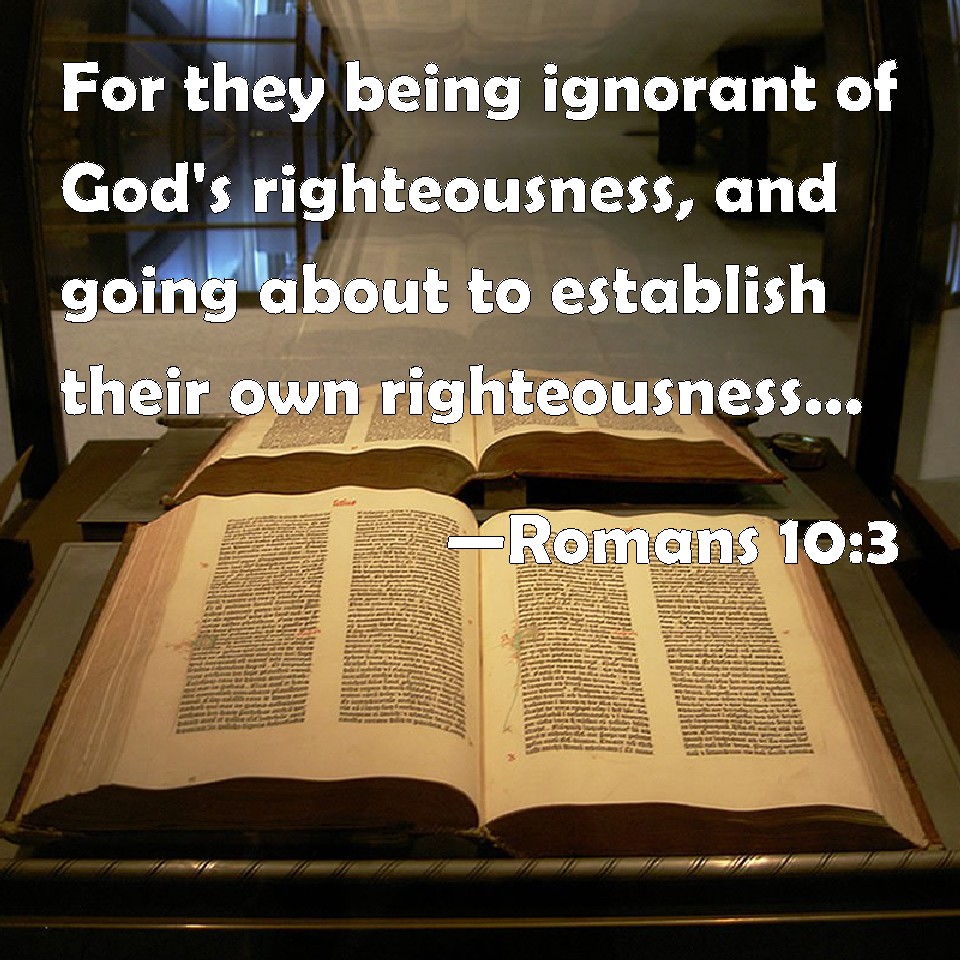 Choose a Background Romans 10:3 For they being ignorant of God's righteousness, and going about to establish their own righteousness, have not submitted themselves to the righteousness of God. KJV: For they being ignorant of God's righteousness, and going about to establish their own righteousness, have not submitted themselves unto the righteousness of God. DRB: For they, not knowing the justice of God, and seeking to establish their own, have not submitted themselves to the justice of God. DBT: For they, being ignorant of God's righteousness, and seeking to establish their own righteousness, have not submitted to the righteousness of God. ERV: For being ignorant of God's righteousness, and seeking to establish their own, they did not subject themselves to the righteousness of God. WBT: For they, being ignorant of God's righteousness, and seeking to establish their own righteousness, have not submitted themselves to the righteousness of God. WEB: For being ignorant of God's righteousness, and seeking to establish their own righteousness, they didn't subject themselves to the righteousness of God. YLT: for not knowing the righteousness of God, and their own righteousness seeking to establish, to the righteousness of God they did not submit.Links Romans 10:3 NIV • Romans 10:3 NLT • Romans 10:3 ESV • Romans 10:3 NASB • Romans 10:3 KJV • Romans 10:3 Interlinear • Romans 10:3 Commentaries • Romans 10:3 Parallel Texts • Romans 10:3 Bible Apps • Romans 10:3 Parallel • Bible Hub |
