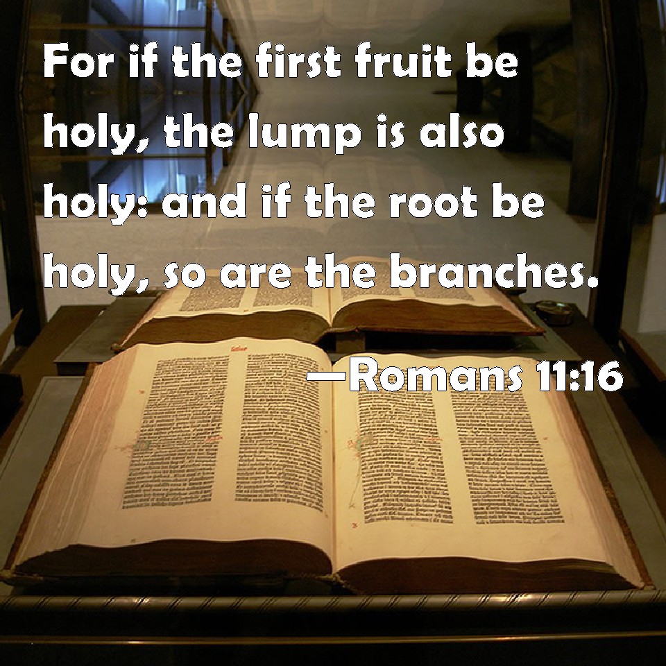 Choose a Background Romans 11:16 For if the first fruit be holy, the lump is also holy: and if the root be holy, so are the branches. KJV: For if the firstfruit be holy, the lump is also holy: and if the root be holy, so are the branches. DRB: For if the firstfruit be holy, so is the lump also: and if the root be holy, so are the branches. DBT: Now if the first-fruit be holy, the lump also; and if the root be holy, the branches also. ERV: And if the firstfruit is holy, so is the lump: and if the root is holy, so are the branches. WBT: For if the first fruit is holy, the lump is also holy: and if the root is holy, so are the branches. WEB: If the first fruit is holy, so is the lump. If the root is holy, so are the branches. YLT: and if the first-fruit is holy, the lump also; and if the root is holy, the branches also.Links Romans 11:16 NIV • Romans 11:16 NLT • Romans 11:16 ESV • Romans 11:16 NASB • Romans 11:16 KJV • Romans 11:16 Interlinear • Romans 11:16 Commentaries • Romans 11:16 Parallel Texts • Romans 11:16 Bible Apps • Romans 11:16 Parallel • Bible Hub |