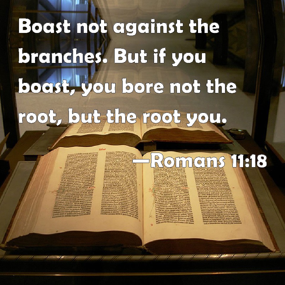 Choose a Background Romans 11:18 Boast not against the branches. But if you boast, you bore not the root, but the root you. KJV: Boast not against the branches. But if thou boast, thou bearest not the root, but the root thee. DRB: Boast not against the branches. But if thou boast, thou bearest not the root, but the root thee. DBT: boast not against the branches; but if thou boast, it is not thou bearest the root, but the root thee. ERV: glory not over the branches: but if thou gloriest, it is not thou that bearest the root, but the root thee. WBT: Boast not against the branches. But if thou boastest, thou bearest not the root, but the root thee. WEB: don't boast over the branches. But if you boast, it is not you who support the root, but the root supports you. YLT: do not boast against the branches; and if thou dost boast, thou dost not bear the root, but the root thee!Links Romans 11:18 NIV • Romans 11:18 NLT • Romans 11:18 ESV • Romans 11:18 NASB • Romans 11:18 KJV • Romans 11:18 Interlinear • Romans 11:18 Commentaries • Romans 11:18 Parallel Texts • Romans 11:18 Bible Apps • Romans 11:18 Parallel • Bible Hub |