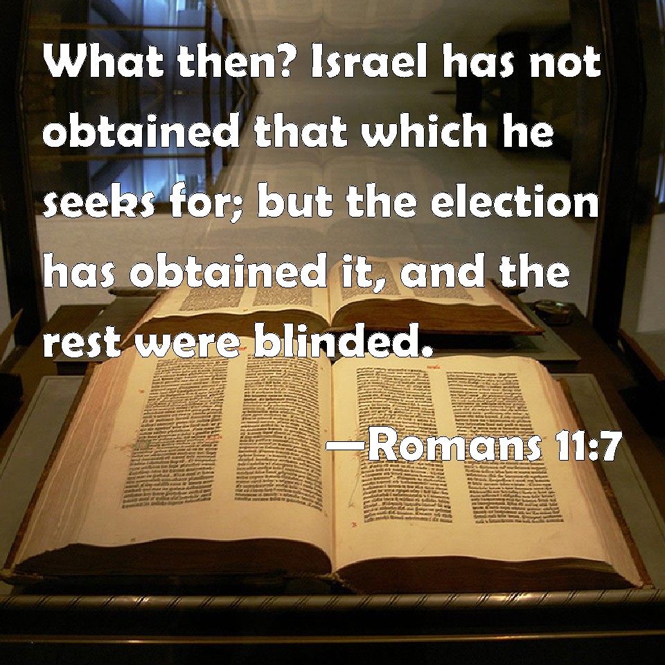Choose a Background Romans 11:7 What then? Israel has not obtained that which he seeks for; but the election has obtained it, and the rest were blinded. KJV: What then? Israel hath not obtained that which he seeketh for; but the election hath obtained it, and the rest were blinded DRB: What then? That which Israel sought, he hath not obtained: but the election hath obtained it; and the rest have been blinded. DBT: What is it then? What Israel seeks for, that he has not obtained; but the election has obtained, and the rest have been blinded, ERV: What then? That which Israel seeketh for, that he obtained not; but the election obtained it, and the rest were hardened: WBT: What then? Israel hath not obtained that which he seeketh for; but the election hath obtained it, and the rest were blinded. WEB: What then? That which Israel seeks for, that he didn't obtain, but the chosen ones obtained it, and the rest were hardened. YLT: What then? What Israel doth seek after, this it did not obtain, and the chosen did obtain, and the rest were hardened,Links Romans 11:7 NIV • Romans 11:7 NLT • Romans 11:7 ESV • Romans 11:7 NASB • Romans 11:7 KJV • Romans 11:7 Interlinear • Romans 11:7 Commentaries • Romans 11:7 Parallel Texts • Romans 11:7 Bible Apps • Romans 11:7 Parallel • Bible Hub |