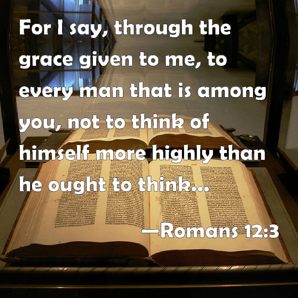 Choose a Background Romans 12:3 For I say, through the grace given to me, to every man that is among you, not to think of himself more highly than he ought to think; but to think soberly, according as God has dealt to every man the measure of faith. KJV: For I say, through the grace given unto me, to every man that is among you, not to think of himself more highly than he ought to think; but to think soberly, according as God hath dealt to every man the measure of faith. DRB: For I say, by the grace that is given me, to all that are among you, not to be more wise than it behoveth to be wise, but to be wise unto sobriety, and according as God hath divided to every one the measure of faith. DBT: For I say, through the grace which has been given to me, to every one that is among you, not to have high thoughts above what he should think; but to think so as to be wise, as God has dealt to each a measure of faith. ERV: For I say, through the grace that was given me, to every man that is among you, not to think of himself more highly than he ought to think; but so to think as to think soberly, according as God hath dealt to each man a measure of faith. WBT: For through the grace given to me, I say, to every man that is among you, not to think of himself more highly than he ought to think; but to think soberly, according as God hath dealt to every man the measure of faith. WEB: For I say, through the grace that was given me, to every man who is among you, not to think of himself more highly than he ought to think; but to think reasonably, as God has apportioned to each person a measure of faith. YLT: For I say, through the grace that was given to me, to every one who is among you, not to think above what it behoveth to think; but to think so as to think wisely, as to each God did deal a measure of faith,Links Romans 12:3 NIV • Romans 12:3 NLT • Romans 12:3 ESV • Romans 12:3 NASB • Romans 12:3 KJV • Romans 12:3 Interlinear • Romans 12:3 Commentaries • Romans 12:3 Parallel Texts • Romans 12:3 Bible Apps • Romans 12:3 Parallel • Bible Hub |