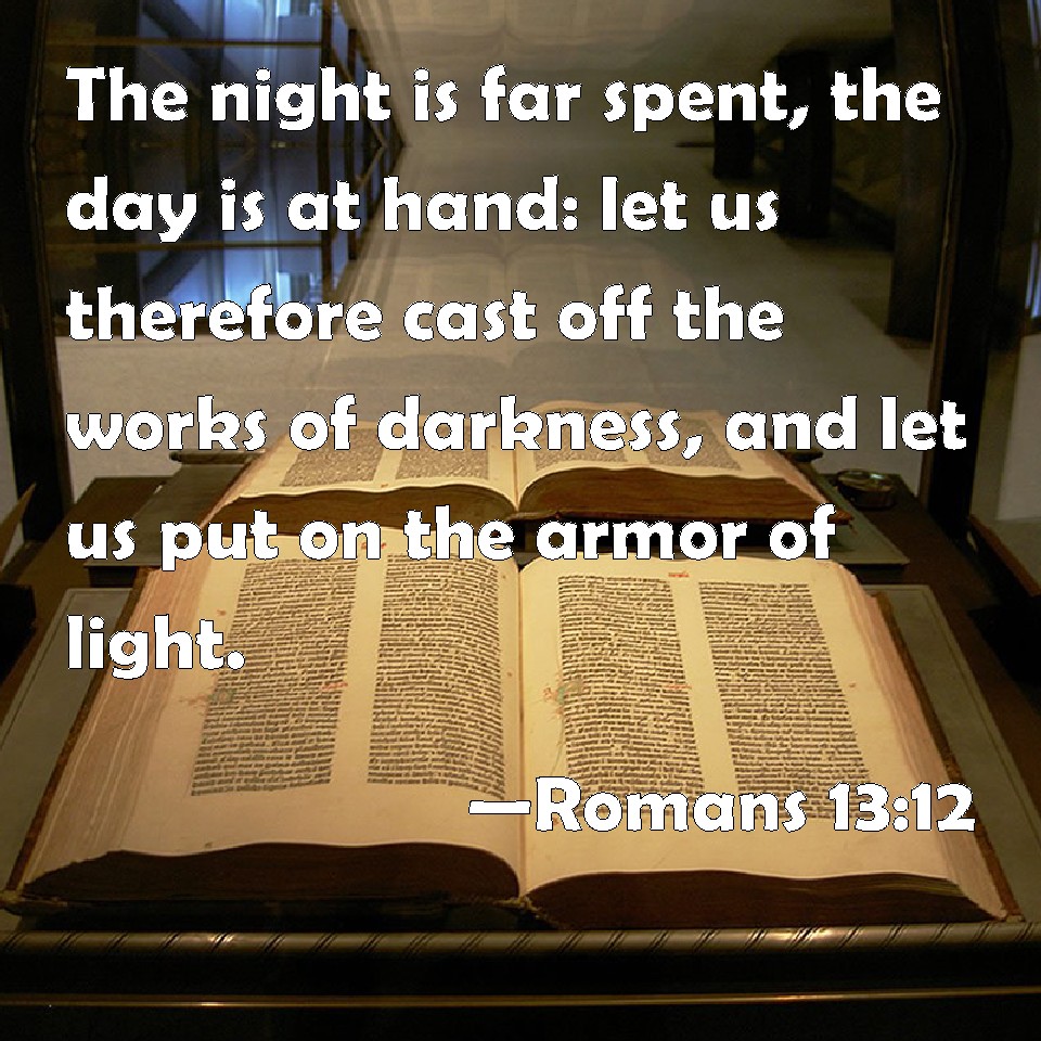 Choose a Background Romans 13:12 The night is far spent, the day is at hand: let us therefore cast off the works of darkness, and let us put on the armor of light. KJV: The night is far spent, the day is at hand: let us therefore cast off the works of darkness, and let us put on the armour of light. DRB: The night is passed, and the day is at hand. Let us therefore cast off the works of darkness, and put on the armour of light. DBT: The night is far spent, and the day is near; let us cast away therefore the works of darkness, and let us put on the armour of light. ERV: The night is far spent, and the day is at hand: let us therefore cast off the works of darkness, and let us put on the armour of light. WBT: The night is far spent, the day is at hand: let us therefore cast off the works of darkness, and let us put on the armor of light. WEB: The night is far gone, and the day is near. Let's therefore throw off the works of darkness, and let's put on the armor of light. YLT: the night did advance, and the day came nigh; let us lay aside, therefore, the works of the darkness, and let us put on the armour of the light;Links Romans 13:12 NIV • Romans 13:12 NLT • Romans 13:12 ESV • Romans 13:12 NASB • Romans 13:12 KJV • Romans 13:12 Interlinear • Romans 13:12 Commentaries • Romans 13:12 Parallel Texts • Romans 13:12 Bible Apps • Romans 13:12 Parallel • Bible Hub |