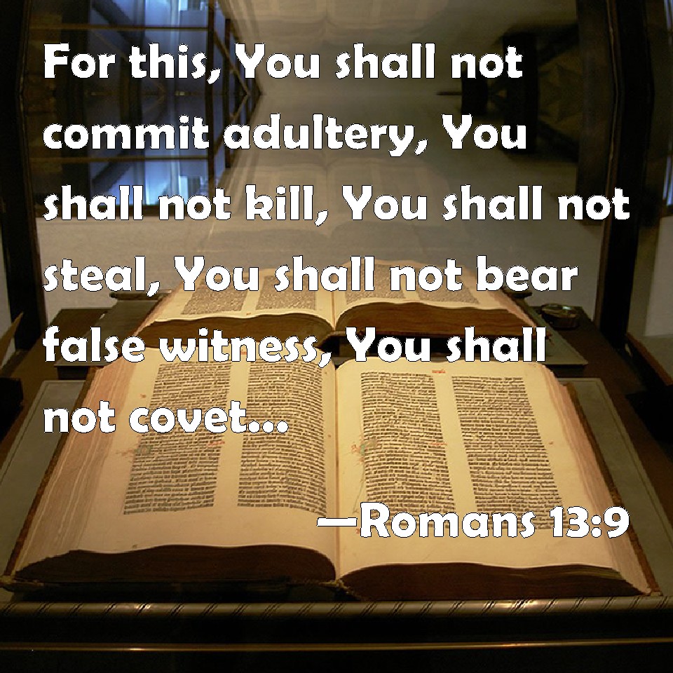 Choose a Background Romans 13:9 For this, You shall not commit adultery, You shall not kill, You shall not steal, You shall not bear false witness, You shall not covet; and if there be any other commandment, it is briefly comprehended in this saying, namely, You shall love your neighbor as yourself. KJV: For this, Thou shalt not commit adultery, Thou shalt not kill, Thou shalt not steal, Thou shalt not bear false witness, Thou shalt not covet; and if there be any other commandment, it is briefly comprehended in this saying, namely, Thou shalt love thy neighbour as thyself. DRB: For Thou shalt not commit adultery: Thou shalt not kill: Thou shalt not steal, Thou shalt not bear false witness: Thou shalt not covet: and if there be any other commandment, it is comprised in this word, Thou shalt love thy neighbour as thyself. DBT: For, Thou shalt not commit adultery, Thou shalt not kill, Thou shalt not steal, Thou shalt not lust; and if there be any other commandment, it is summed up in this word, namely, Thou shalt love thy neighbour as thyself. ERV: For this, Thou shalt not commit adultery, Thou shalt not kill, Thou shalt not steal, Thou shalt not covet, and if there be any other commandment, it is summed up in this word, namely, Thou shalt love thy neighbour as thyself. WBT: For this, Thou shalt not commit adultery, Thou shalt not kill, Thou shalt not steal, Thou shalt not bear false witness, Thou shalt not covet; and if there is any other commandment, it is briefly comprehended in this saying, namely, Thou shalt love thy neighbor as thyself. WEB: For the commandments, "You shall not commit adultery," "You shall not murder," "You shall not steal," "You shall not give false testimony," "You shall not covet," and whatever other commandments there are, are all summed up in this saying, namely, "You shall love your neighbor as yourself." YLT: for, 'Thou shalt not commit adultery, Thou shalt do no murder, Thou shalt not steal, Thou shalt not bear false testimony, Thou shalt not covet;' and if there is any other command, in this word it is summed up, in this: 'Thou shalt love thy neighbour as thyself;'Links Romans 13:9 NIV • Romans 13:9 NLT • Romans 13:9 ESV • Romans 13:9 NASB • Romans 13:9 KJV • Romans 13:9 Interlinear • Romans 13:9 Commentaries • Romans 13:9 Parallel Texts • Romans 13:9 Bible Apps • Romans 13:9 Parallel • Bible Hub |