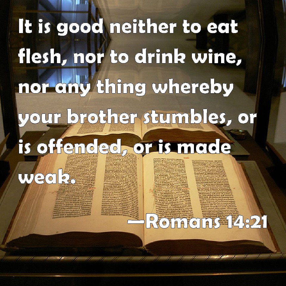 Choose a Background Romans 14:21 It is good neither to eat flesh, nor to drink wine, nor any thing whereby your brother stumbles, or is offended, or is made weak. KJV: It is good neither to eat flesh, nor to drink wine, nor any thing whereby thy brother stumbleth, or is offended, or is made weak. DRB: It is good not to eat flesh, and not to drink wine, nor any thing whereby thy brother is offended, or scandalized, or made weak. DBT: It is right not to eat meat, nor drink wine, nor do anything in which thy brother stumbles, or is offended, or is weak. ERV: It is good not to eat flesh, nor to drink wine, nor to do anything whereby thy brother stumbleth. WBT: It is good neither to eat flesh, nor to drink wine, nor any thing by which thy brother stumbleth, or is offended, or is made weak. WEB: It is good to not eat meat, drink wine, nor do anything by which your brother stumbles, is offended, or is made weak. YLT: Right it is not to eat flesh, nor to drink wine, nor to do anything in which thy brother doth stumble, or is made to fall, or is weak.Links Romans 14:21 NIV • Romans 14:21 NLT • Romans 14:21 ESV • Romans 14:21 NASB • Romans 14:21 KJV • Romans 14:21 Interlinear • Romans 14:21 Commentaries • Romans 14:21 Parallel Texts • Romans 14:21 Bible Apps • Romans 14:21 Parallel • Bible Hub |