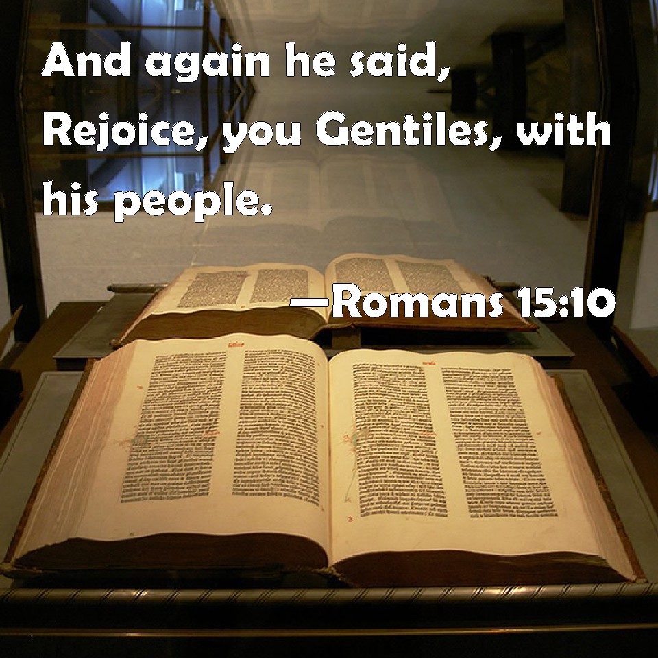 Choose a Background Romans 15:10 And again he said, Rejoice, you Gentiles, with his people. KJV: And again he saith, Rejoice, ye Gentiles, with his people. DRB: And again he saith: Rejoice, ye Gentiles, with his people. DBT: And again he says, Rejoice, nations, with his people. ERV: And again he saith, Rejoice, ye Gentiles, with his people. WBT: And again he saith, Rejoice, ye Gentiles, with his people. WEB: Again he says, "Rejoice, you Gentiles, with his people." YLT: and again it saith, 'Rejoice ye nations, with His people;'Links Romans 15:10 NIV • Romans 15:10 NLT • Romans 15:10 ESV • Romans 15:10 NASB • Romans 15:10 KJV • Romans 15:10 Interlinear • Romans 15:10 Commentaries • Romans 15:10 Parallel Texts • Romans 15:10 Bible Apps • Romans 15:10 Parallel • Bible Hub |