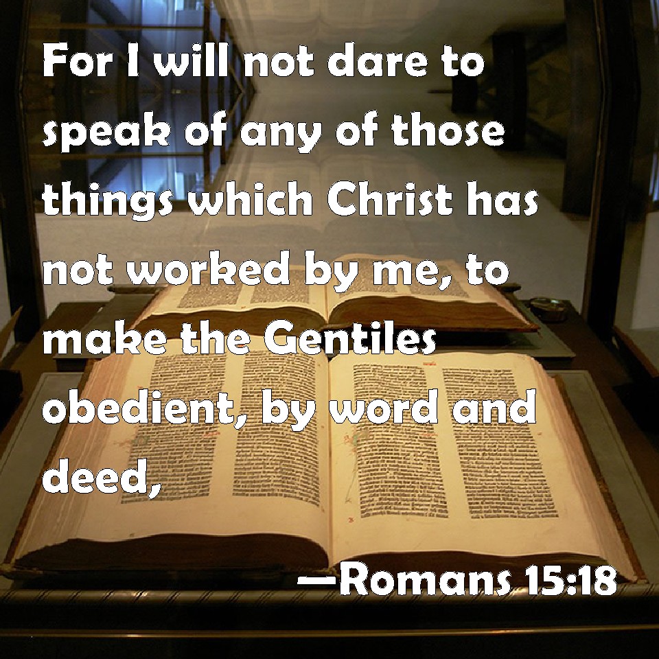 Choose a Background Romans 15:18 For I will not dare to speak of any of those things which Christ has not worked by me, to make the Gentiles obedient, by word and deed, KJV: For I will not dare to speak of any of those things which Christ hath not wrought by me, to make the Gentiles obedient, by word and deed, DRB: For I dare not to speak of any of those things which Christ worketh not by me, for the obedience of the Gentiles, by word and deed, DBT: For I will not dare to speak anything of the things which Christ has not wrought by me, for the obedience of the nations, by word and deed, ERV: For I will not dare to speak of any things save those which Christ wrought through me, for the obedience of the Gentiles, by word and deed, WBT: For I will not dare to speak of any of those things which Christ hath not wrought by me, to make the Gentiles obedient, by word and deed, WEB: For I will not dare to speak of any things except those which Christ worked through me, for the obedience of the Gentiles, by word and deed, YLT: for I will not dare to speak anything of the things that Christ did not work through me, to obedience of nations, by word and deed,Links Romans 15:18 NIV • Romans 15:18 NLT • Romans 15:18 ESV • Romans 15:18 NASB • Romans 15:18 KJV • Romans 15:18 Interlinear • Romans 15:18 Commentaries • Romans 15:18 Parallel Texts • Romans 15:18 Bible Apps • Romans 15:18 Parallel • Bible Hub |