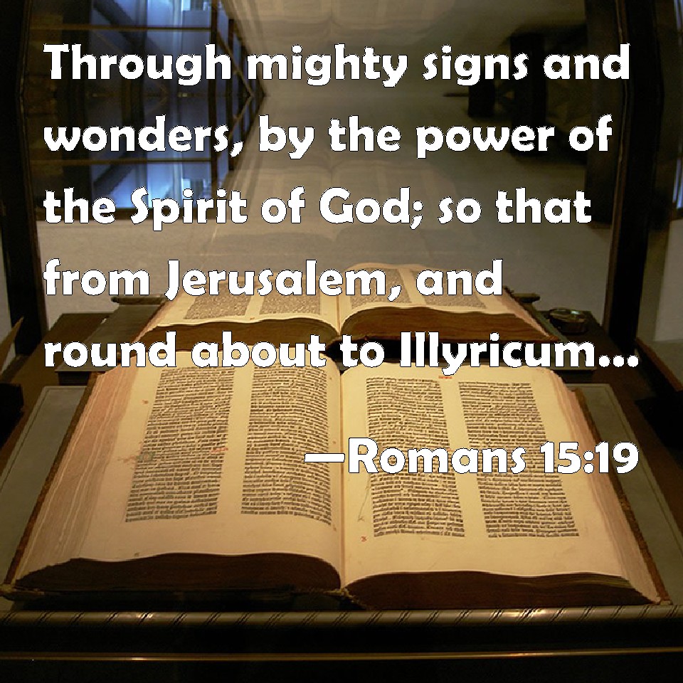 Choose a Background Romans 15:19 Through mighty signs and wonders, by the power of the Spirit of God; so that from Jerusalem, and round about to Illyricum, I have fully preached the gospel of Christ. KJV: Through mighty signs and wonders, by the power of the Spirit of God; so that from Jerusalem, and round about unto Illyricum, I have fully preached the gospel of Christ. DRB: By the virtue of signs and wonders, in the power of the Holy Ghost, so that from Jerusalem round about as far as unto Illyricum, I have replenished the gospel of Christ. DBT: in the power of signs and wonders, in the power of the Spirit of God; so that I, from Jerusalem, and in a circuit round to Illyricum, have fully preached the glad tidings of the Christ; ERV: in the power of signs and wonders, in the power of the Holy Ghost; so that from Jerusalem, and round about even unto Illyricum, I have fully preached the gospel of Christ; WBT: Through mighty signs and wonders, by the power of the Spirit of God; so that from Jerusalem, and around to Illyricum, I have fully preached the gospel of Christ. WEB: in the power of signs and wonders, in the power of God's Spirit; so that from Jerusalem, and around as far as to Illyricum, I have fully preached the Good News of Christ; YLT: in power of signs and wonders, in power of the Spirit of God; so that I, from Jerusalem, and in a circle as far as Illyricum, have fully preached the good news of the Christ;Links Romans 15:19 NIV • Romans 15:19 NLT • Romans 15:19 ESV • Romans 15:19 NASB • Romans 15:19 KJV • Romans 15:19 Interlinear • Romans 15:19 Commentaries • Romans 15:19 Parallel Texts • Romans 15:19 Bible Apps • Romans 15:19 Parallel • Bible Hub |