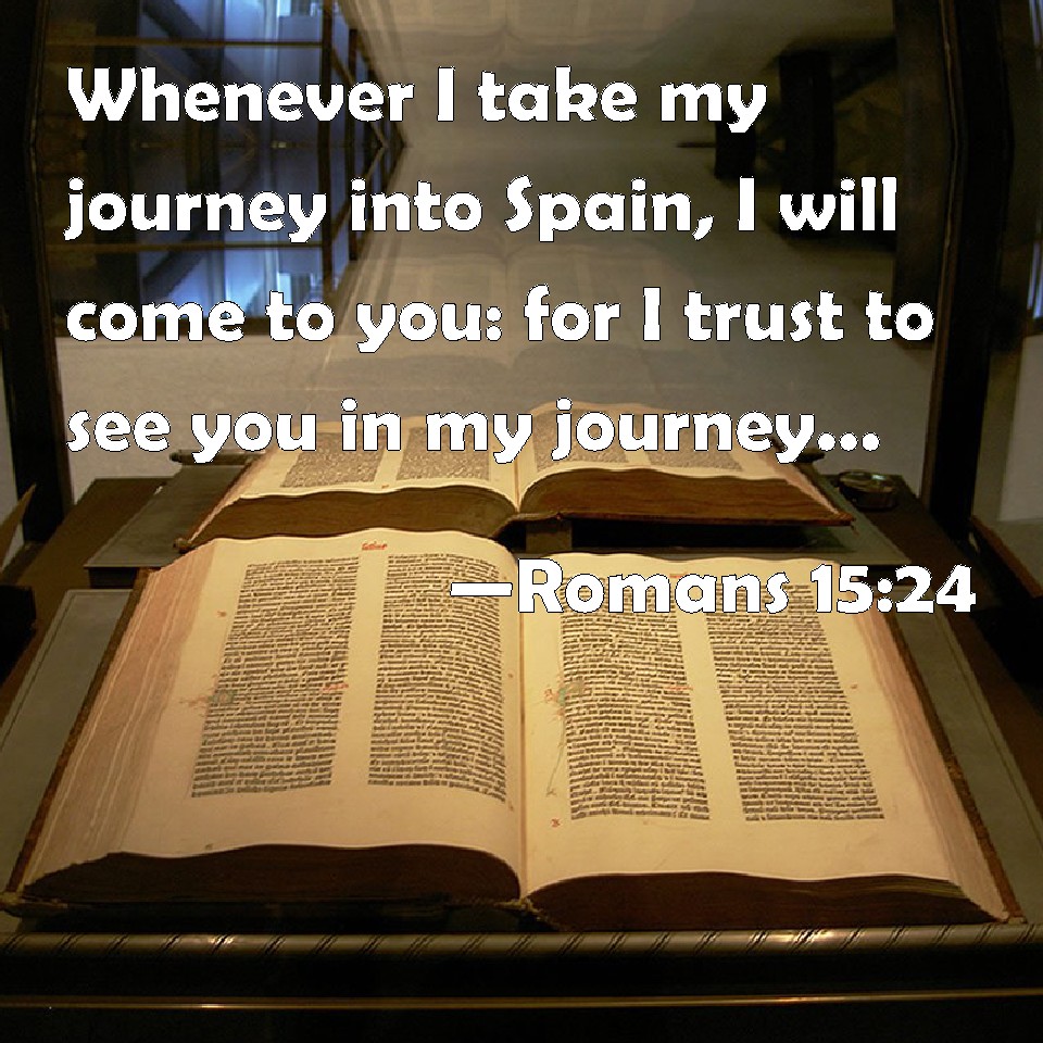 Choose a Background Romans 15:24 Whenever I take my journey into Spain, I will come to you: for I trust to see you in my journey, and to be brought on my way thitherward by you, if first I be somewhat filled with your company. KJV: Whensoever I take my journey into Spain, I will come to you: for I trust to see you in my journey, and to be brought on my way thitherward by you, if first I be somewhat filled with your company. DRB: When I shall begin to take my journey into Spain, I hope that as I pass, I shall see you, and be brought on my way thither by you, if first, in part, I shall have enjoyed you: DBT: whenever I should go to Spain; (for I hope to see you as I go through, and by you to be set forward thither, if first I shall have been in part filled with your company;) ERV: whensoever I go unto Spain (for I hope to see you in my journey, and to be brought on my way thitherward by you, if first in some measure I shall have been satisfied with your company)— WBT: Whenever I take my journey into Spain, I will come to you: for I trust to see you in my journey, and to be brought on my way thitherward by you, if first I shall be somewhat filled with your company. WEB: whenever I journey to Spain, I will come to you. For I hope to see you on my journey, and to be helped on my way there by you, if first I may enjoy your company for a while. YLT: when I may go on to Spain I will come unto you, for I hope in going through, to see you, and by you to be set forward thither, if of you first, in part, I shall be filled.Links Romans 15:24 NIV • Romans 15:24 NLT • Romans 15:24 ESV • Romans 15:24 NASB • Romans 15:24 KJV • Romans 15:24 Interlinear • Romans 15:24 Commentaries • Romans 15:24 Parallel Texts • Romans 15:24 Bible Apps • Romans 15:24 Parallel • Bible Hub |