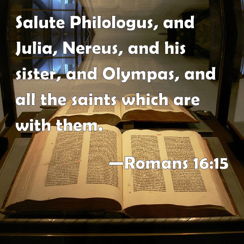 Choose a Background Romans 16:15 Salute Philologus, and Julia, Nereus, and his sister, and Olympas, and all the saints which are with them. KJV: Salute Philologus, and Julia, Nereus, and his sister, and Olympas, and all the saints which are with them. DRB: Salute Philologus and Julia, Nereus and his sister, and Olympias; and all the saints that are with them. DBT: Salute Philologus, and Julia, Nereus, and his sister, and Olympas, and all the saints with them. ERV: Salute Philologus and Julia, Nereus and his sister, and Olympas, and all the saints that are with them. WBT: Salute Philologus, and Julia, Nereus, and his sister, and Olympas, and all the saints who are with them. WEB: Greet Philologus and Julia, Nereus and his sister, and Olympas, and all the saints who are with them. YLT: salute Philologus, and Julias, Nereus, and his sister, and Olympas, and all the saints with them;Links Romans 16:15 NIV • Romans 16:15 NLT • Romans 16:15 ESV • Romans 16:15 NASB • Romans 16:15 KJV • Romans 16:15 Interlinear • Romans 16:15 Commentaries • Romans 16:15 Parallel Texts • Romans 16:15 Bible Apps • Romans 16:15 Parallel • Bible Hub |