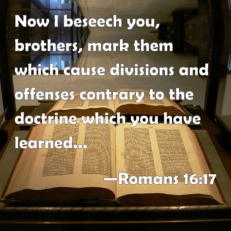 Choose a Background Romans 16:17 Now I beseech you, brothers, mark them which cause divisions and offenses contrary to the doctrine which you have learned; and avoid them. KJV: Now I beseech you, brethren, mark them which cause divisions and offences contrary to the doctrine which ye have learned; and avoid them. DRB: Now I beseech you, brethren, to mark them who make dissensions and offences contrary to the doctrine which you have learned, and avoid them. DBT: But I beseech you, brethren, to consider those who create divisions and occasions of falling, contrary to the doctrine which ye have learnt, and turn away from them. ERV: Now I beseech you, brethren, mark them which are causing the divisions and occasions of stumbling, contrary to the doctrine which ye learned: and turn away from them. WBT: Now I beseech you, brethren, mark them who cause divisions and offenses, contrary to the doctrine which ye have learned; and avoid them. WEB: Now I beg you, brothers, look out for those who are causing the divisions and occasions of stumbling, contrary to the doctrine which you learned, and turn away from them. YLT: And I call upon you, brethren, to mark those who the divisions and the stumbling-blocks, contrary to the teaching that ye did learn, are causing, and turn ye away from them;Links Romans 16:17 NIV • Romans 16:17 NLT • Romans 16:17 ESV • Romans 16:17 NASB • Romans 16:17 KJV • Romans 16:17 Interlinear • Romans 16:17 Commentaries • Romans 16:17 Parallel Texts • Romans 16:17 Bible Apps • Romans 16:17 Parallel • Bible Hub |
