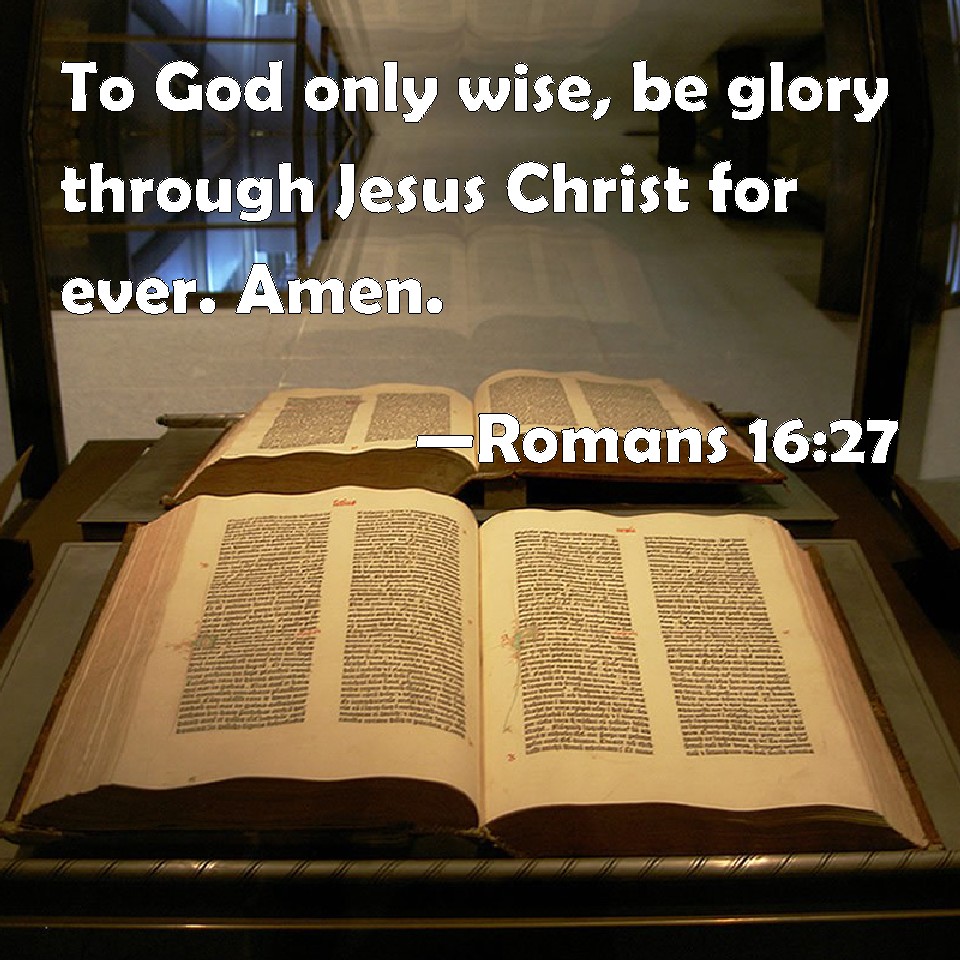 Choose a Background Romans 16:27 To God only wise, be glory through Jesus Christ for ever. Amen. KJV: To God only wise, be glory through Jesus Christ for ever. Amen. DRB: To God the only wise, through Jesus Christ, to whom be honour and glory for ever and ever. Amen. DBT: the only wise God, through Jesus Christ, to whom be glory for ever. Amen. ERV: to the only wise God, through Jesus Christ, to whom be the glory for ever. Amen. WBT: To God the only wise, be glory through Jesus Christ for ever. Amen. WEB: (14:26) to the only wise God, through Jesus Christ, to whom be the glory forever! Amen. YLT: to the only wise God, through Jesus Christ, to him be glory to the ages. Amen.Links Romans 16:27 NIV • Romans 16:27 NLT • Romans 16:27 ESV • Romans 16:27 NASB • Romans 16:27 KJV • Romans 16:27 Interlinear • Romans 16:27 Commentaries • Romans 16:27 Parallel Texts • Romans 16:27 Bible Apps • Romans 16:27 Parallel • Bible Hub |