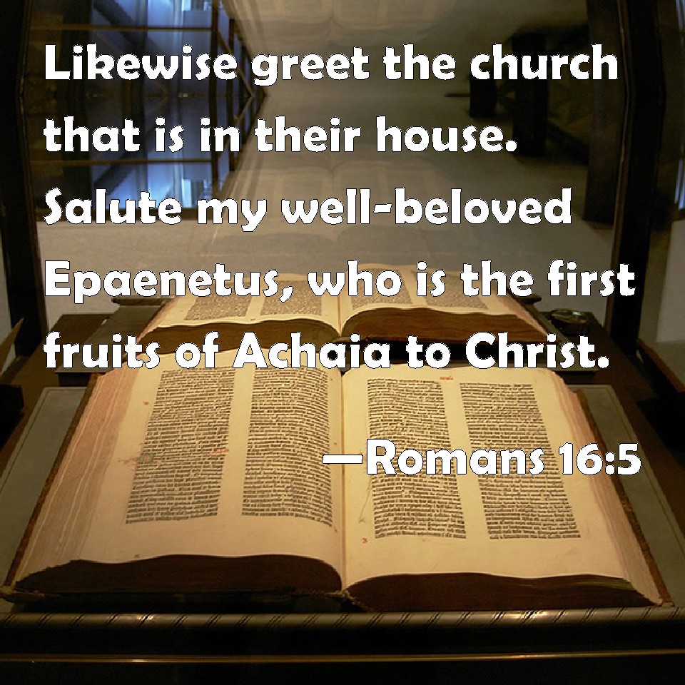 Choose a Background Romans 16:5 Likewise greet the church that is in their house. Salute my well-beloved Epaenetus, who is the first fruits of Achaia to Christ. KJV: Likewise greet the church that is in their house. Salute my wellbeloved Epaenetus, who is the firstfruits of Achaia unto Christ. DRB: And the church which is in their house. Salute Epenetus, my beloved: who is the firstfruits of Asia in Christ. DBT: and the assembly at their house. Salute Epaenetus, my beloved, who is the first-fruits of Asia for Christ. ERV: and salute the church that is in their house. Salute Epaenetus my beloved, who is the firstfruits of Asia unto Christ. WBT: Likewise greet the church that is in their house. Salute my well-beloved Epenetus, who is the first-fruits of Achaia to Christ. WEB: Greet the assembly that is in their house. Greet Epaenetus, my beloved, who is the first fruits of Achaia to Christ. YLT: and the assembly at their house; salute Epaenetus, my beloved, who is first-fruit of Achaia to Christ.Links Romans 16:5 NIV • Romans 16:5 NLT • Romans 16:5 ESV • Romans 16:5 NASB • Romans 16:5 KJV • Romans 16:5 Interlinear • Romans 16:5 Commentaries • Romans 16:5 Parallel Texts • Romans 16:5 Bible Apps • Romans 16:5 Parallel • Bible Hub |