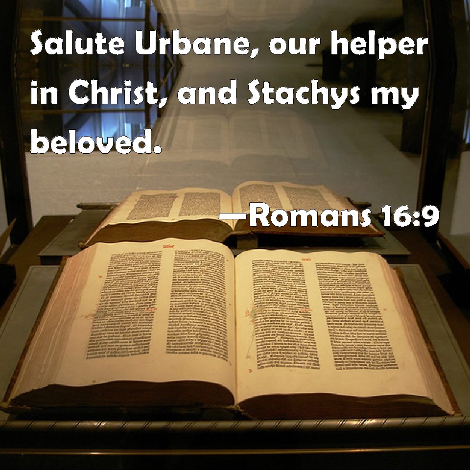 Choose a Background Romans 16:9 Salute Urbane, our helper in Christ, and Stachys my beloved. KJV: Salute Urbane, our helper in Christ, and Stachys my beloved. DRB: Salute Urbanus, our helper in Christ Jesus, and Stachys, my beloved. DBT: Salute Urbanus, our fellow-workman in Christ, and Stachys, my beloved. ERV: Salute Urbanus our fellow-worker in Christ, and Stachys my beloved. WBT: Salute Urbane, our helper in Christ, and Stachys my beloved. WEB: Greet Urbanus, our fellow worker in Christ, and Stachys, my beloved. YLT: salute Arbanus, our fellow-workman in Christ, and Stachys, my beloved;Links Romans 16:9 NIV • Romans 16:9 NLT • Romans 16:9 ESV • Romans 16:9 NASB • Romans 16:9 KJV • Romans 16:9 Interlinear • Romans 16:9 Commentaries • Romans 16:9 Parallel Texts • Romans 16:9 Bible Apps • Romans 16:9 Parallel • Bible Hub |